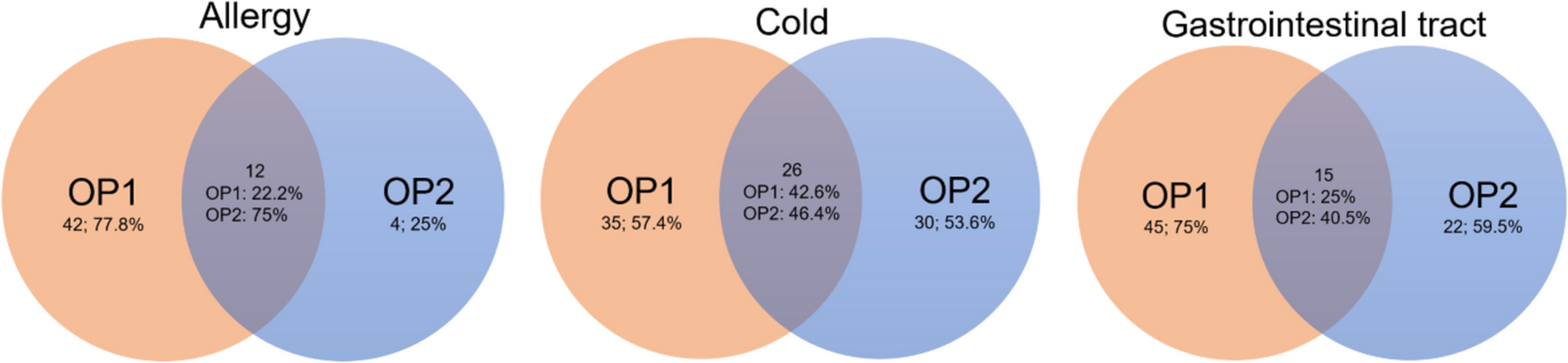 Illustration of the intersections (same products) of the products offered in the product catalogues of the online pharmacies OP1 and OP2 divided by indication category in three Venn diagrams; OP1 shown in orange and OP2 in blue