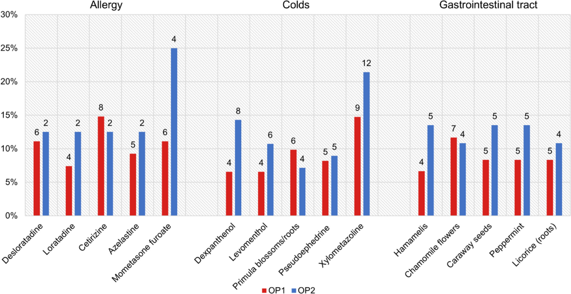 Xylometazoline is the most common active ingredient in both OP2 with 21.4% (12) and OP1 with 14.3% (9). This is an alpha1-adrenoreceptor agonist, which can be used locally with its vasoconstrictive effect in conjunctivitis or to reduce swelling in rhinitis (Seifert 2018). In the catalogues, xylometazoline is offered both as a monopreparation and in combination with dexpanthenol in the form of nasal sprays.