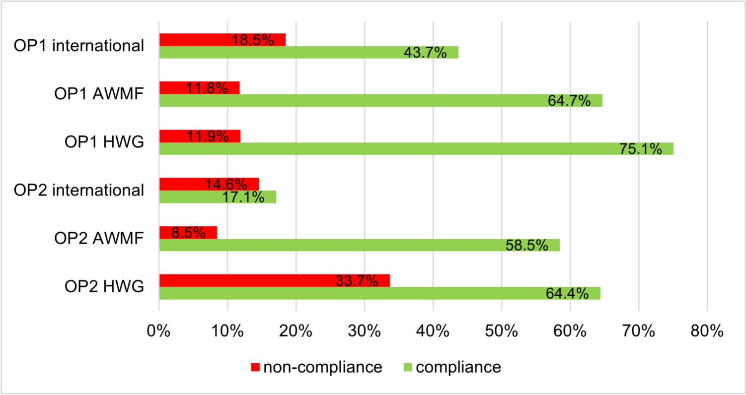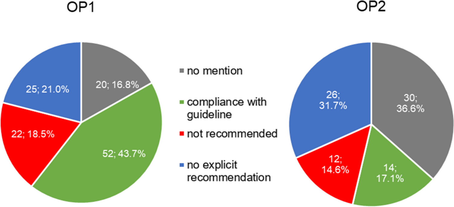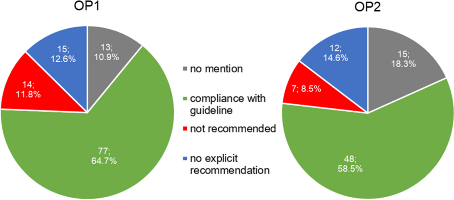 Figure 8 shows the conformity of the international guidelines with the products offered from the OP1 and OP2 catalogues. The treatment recommendation was complied with by 43.7% (52) of the products from OP1 and 17.1% (14) from OP2. Table 2 contains a comparison of the percentage assessment of the national AWMF and international guidelines.