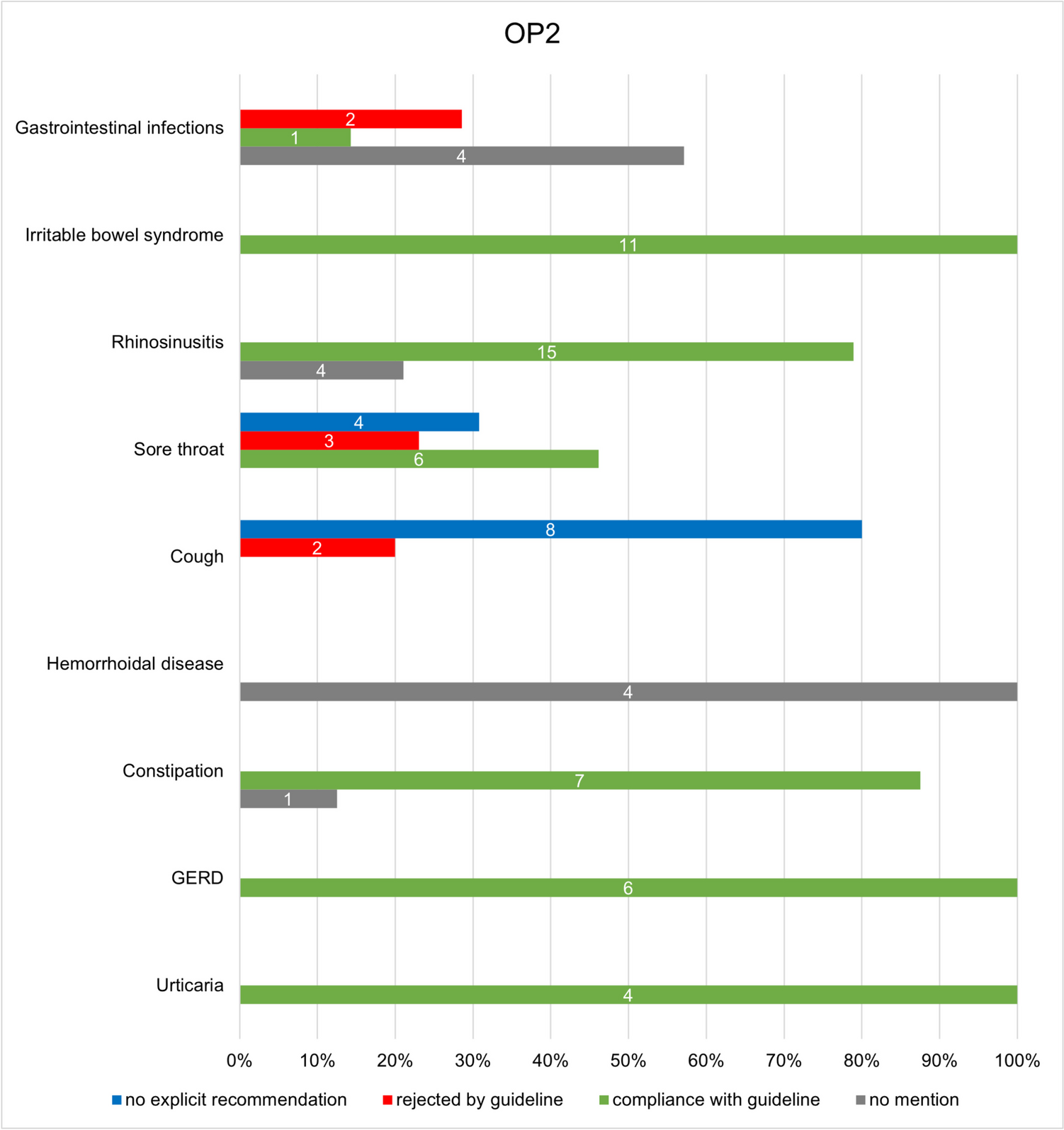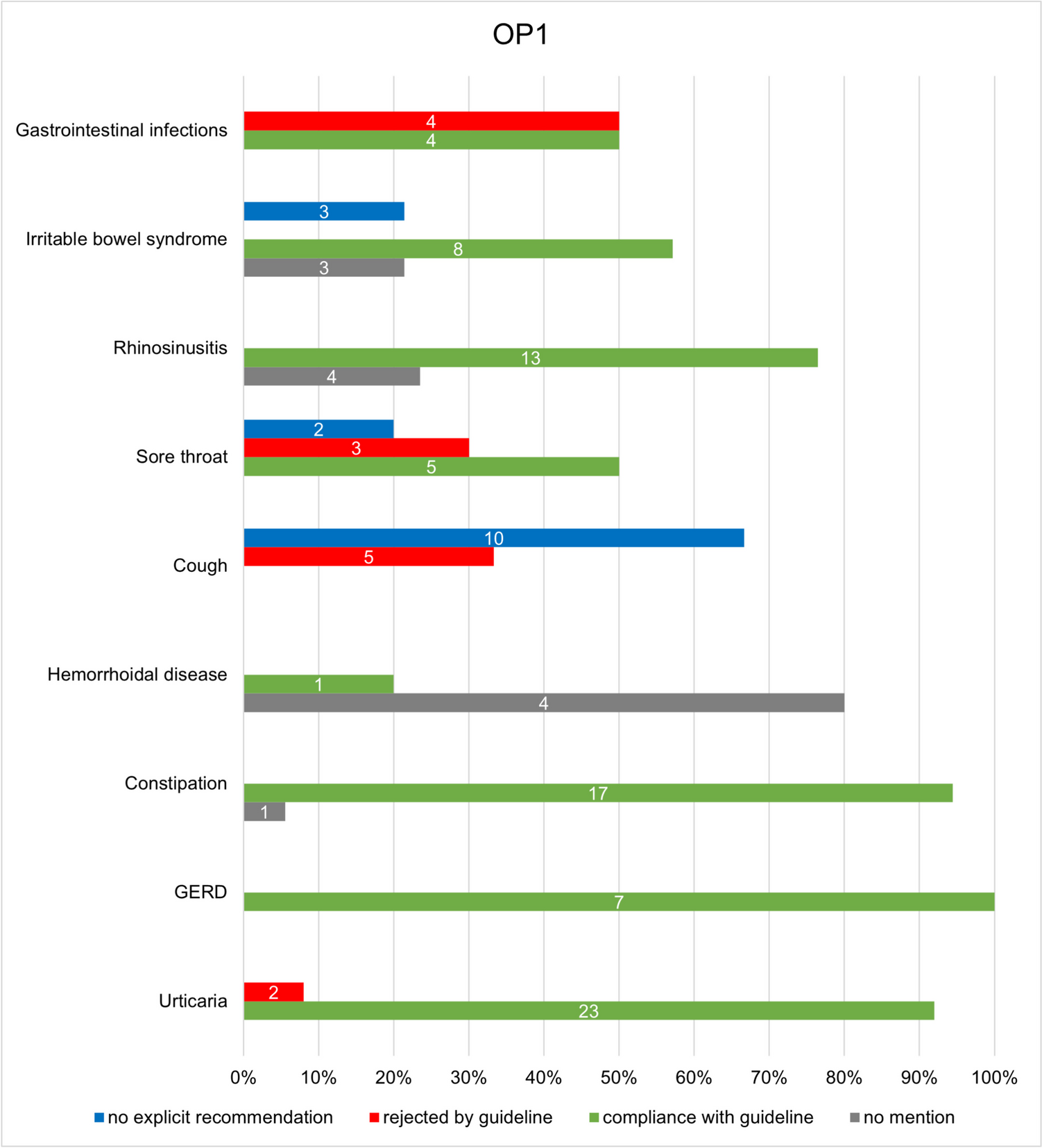 The analysis of the nine guidelines only included some of the products considered in the catalogues due to the fact that not all indications are covered by the guidelines. Consequently, a total of 126 different products were included for OP1, which means 66.3% of the products analyzed in the areas of allergy, colds, and gastrointestinal tract from OP1 were included as well as 72 different products for OP2, which means 66.1% of the products analyzed from the OP2 catalogue. Some of the products were included in multiple guidelines if the products had multiple matching indications.