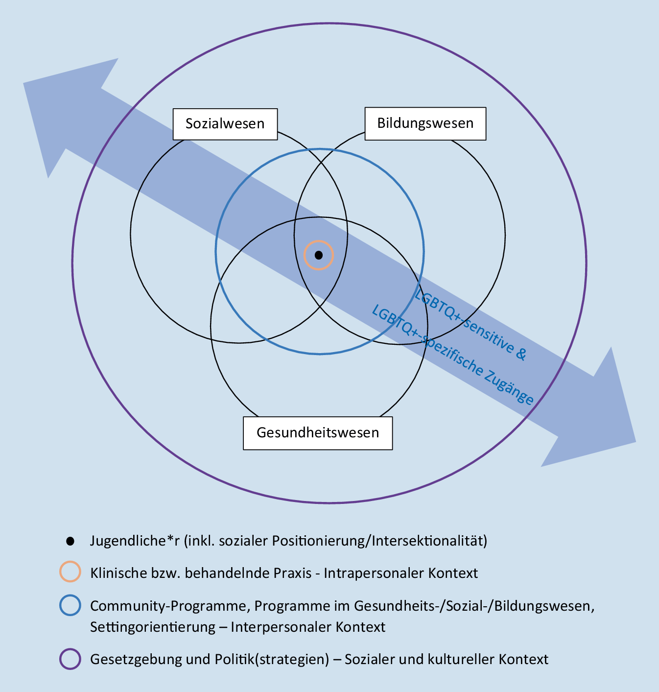 Die Literaturrecherche zeigte: Evidenzbasierte, gut evaluierte Zugänge der Arbeit mit LGBTQ+-Jugendlichen, selbst über ganz verschiedene Settings wie Schulen, Community-basierte Organisationen oder die klinischen Behandlung betrachtet, fehlen [5, 33, 37]. Spezifische und LGBTQ+-sensitive Zugänge und Interventionen für LGBTQ+-Jugendliche müssen dringend geschaffen und beforscht werden [5]. Nur so kann eine auf empirische Forschungsresultate abgestützte und wirksame Suizidprävention für und mit diesen Gruppen etabliert werden. Bestehende Vorschläge zur Stärkung psychischer Gesundheit und Suizidprävention bei LGBTQ+-Jugendlichen sind mehrheitlich aus der (sozial)pädagogischen und klinisch-psychologischen/psychiatrischen Perspektive verfasst [14, 20, 33]. Bei allen rücken das Sozial- und Gesundheitswesen in seiner ganzen Breite (u. a. Sozialarbeitende, Kinderärzt:innen, Pflegefachpersonen etc.) und die auch von der WHO vielgeforderte multisektorale Zusammenarbeit [42, 43] nicht in den Blick. Weiter ist zu bemängeln, dass der Diversität außerhalb der Dimensionen Geschlechtsidentität und sexuelle Orientierung noch zu wenig Rechnung getragen wird, die Schnittstellen zu anderen (Benachteiligungs‑)Merkmalen wie z. B. sozioökonomischer Status oder „race“ etc. außenvorbleiben. Eine intersektionale Perspektive fehlt. Ausgehend vom Modell von Russell und Fish [33] wird deshalb nachfolgend der Versuch unternommen, suizidpräventive Zugänge für LGBTQ+-Jugendliche konsequent multisektoral, interprofessionell und intersektional zu denken (s. Abb. 1).