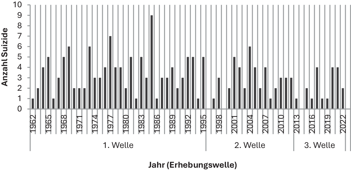 Seit über 60 Jahren werden Suizidfälle im Hamburger Strafvollzug wissenschaftlich erfasst und hinsichtlich ihrer Ursachen und Risikofaktoren analysiert, um Maßnahmen der Suizidprävention fortlaufend zu verbessern. Von 1962–2022 wurden insgesamt 190 Suizide dokumentiert (Abb. 1; [2‐5]). Die Auswertungen 1962–1995 erfolgten durch Granzow und Püschel (1. Erhebungszeitraum), jene für 1996–2012 durch Petersen et al. (2. Erhebungszeitraum). Die vorliegende Arbeit untersucht die Jahre 2013–2022 als 3. Erhebungszeitraum. Insgesamt wiesen die Hamburger Vollzugsanstalten stärkere Schwankungen in den Suizidfällen auf als Vollzugsanstalten im Bundesdurchschnitt (Tab. 1). Während des Beginns der Pandemie (2020/2021) traten in Hamburg Prävalenzspitzen auf, wohingegen die Suizidraten in der Allgemeinbevölkerung relativ konstant blieben.