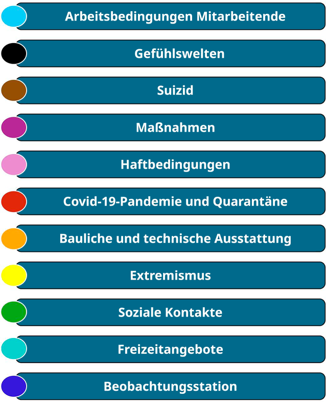 Die qualitativen Interviews basierten auf je 9 Leitfragen mit Folgefragen (siehe Onlinematerial, Anhänge A und B). Inhaftierte erhielten im Anschluss daran ein Guthaben von 5 €. Die qualitative Auswertung erfolgte in Form einer Inhaltsanalyse [6] unter Verwendung einer deduktiv-induktiven Kategorisierung mit MAXQDA 2022 (VERBI Software, 2021). In der deduktiven Phase werden Kategorien entwickelt, die auf theoretischen Annahmen sowie der Struktur des Interviewbogens basieren und dann auf das Datenmaterial angewendet werden. In der induktiven Phase werden Kategorien gebildet, die direkt während der Analyse aus den Daten selbst hervorgehen. Intercoder-Reliabilität wurde durch mehrfaches Kodieren und Überarbeitung des Schemas sichergestellt.