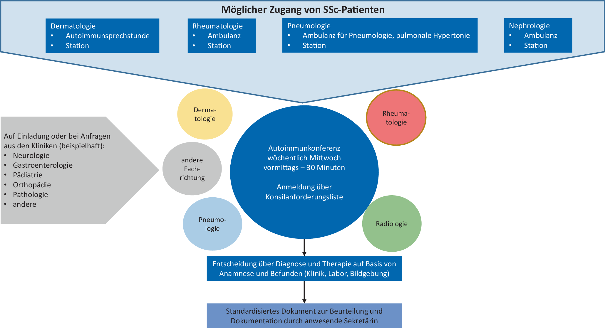 Im Folgenden möchten wir exemplarisch das Dresdener Autoimmunzentrum darstellen und beispielhaft den Nutzen, aber auch die Herausforderungen, die die Arbeit eines solchen Zentrums mit sich bringen, aufzeigen. Zum anderen wollen wir am Beispiel der SSc und anhand eines standardisierten Diagnostik- und Therapiepfades aufzeigen, welche Bedeutung SOPs (Standardisierte Diagnostik- und Behandlungspfade) und die Durchführung von interdisziplinären Fallkonferenzen im Kontext von Autoimmunzentren für die Betreuung von Patient:innen mit seltenen Erkrankungen haben.
