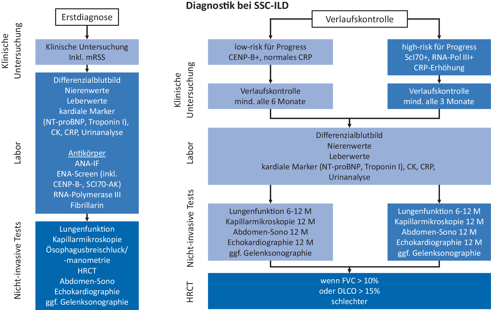 Diese Empfehlung wurde in die vorgestellte SOP aufgenommen, auch wenn in anderen Empfehlungen, wie z. B. dem DETECT-Algorithmus, die Notwendigkeit wiederholter Echokardiographien differenzierter gestellt wird. Sofern dies in Zentren nicht möglich ist, kann die Notwendigkeit einer Echokardiographie auch mit dem DETECT-Algorithmus bestimmt werden, um die Vortestwahrscheinlichkeit für eine PAH zu erhöhen [5]. Wiederholte HRCT-Untersuchungen sollten bei einem Abfall der forcierten Vitalkapazität (FVC) von mehr als 10 % oder der Diffusionskapazität für Kohlenmonoxid (DLCO) von mehr als 15 % erfolgen, wobei zunächst auch eine Kontrolle der Lungenfunktionsmessungen z. B. nach 1 bis 3 Monaten sinnvoll sein kann, wenn überlagernde Gründe für die Verschlechterung der Messwerte offensichtlich sind (z. B. schmerzbedingte Einschränkung der Durchführung, kurz zurückliegende Atemwegsinfekte etc.). Bei hohem Risiko für Progress wird von einigen Experten ein Monitoring mittels Lungen-CT empfohlen [11]. Für letzteres Vorgehen gibt es jedoch relativ wenig Evidenz.