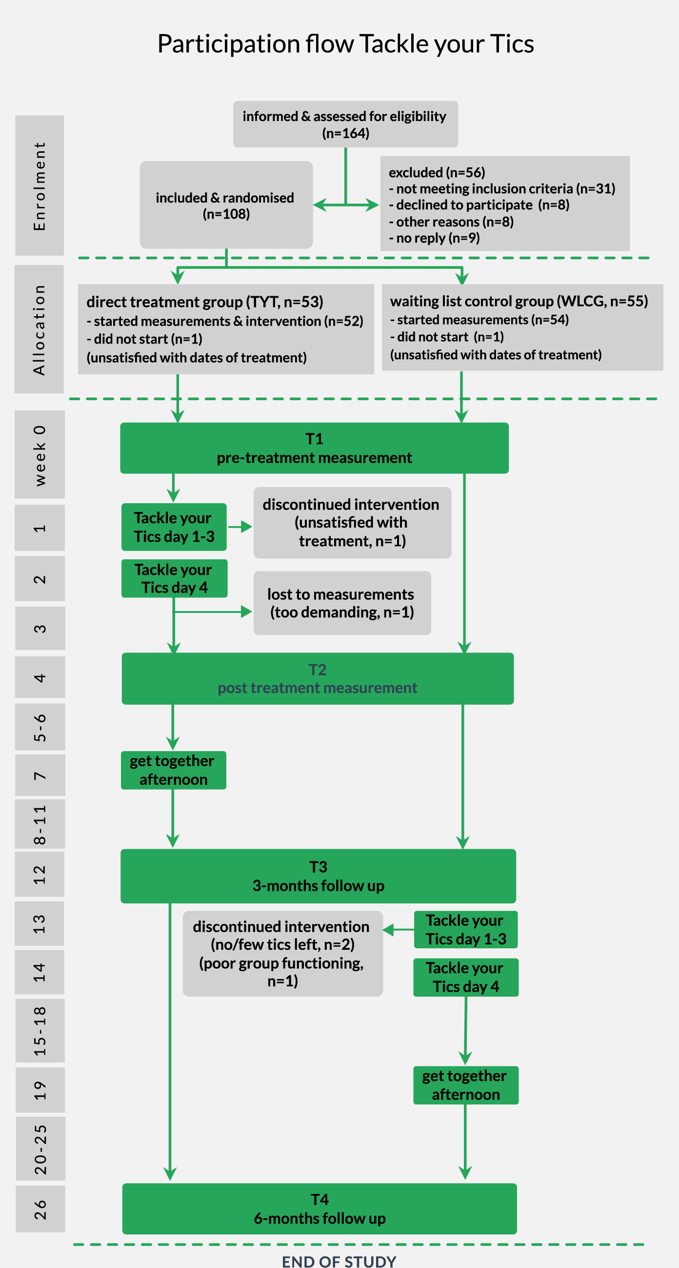 This investigator-blinded, randomised controlled trial studied the efficacy of the Tackle your Tics treatment (TYT), compared with a waiting list control group (WLCG, 3 months waiting) in children and adolescents with tic disorders in a 1:1 ratio.