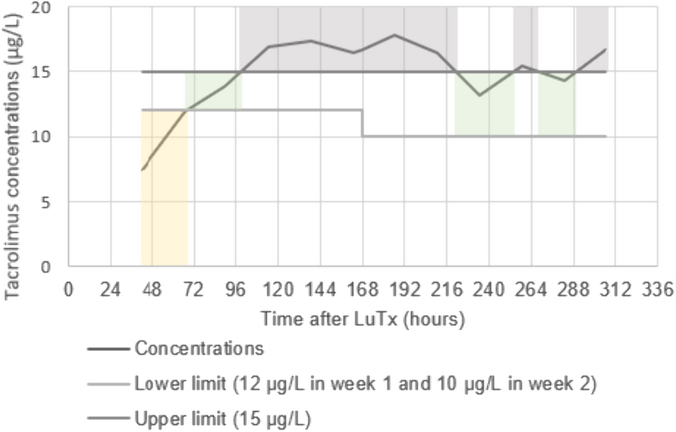 Representation of the calculation of the time in- and outside of the therapeutic range of tacrolimus. The green, grey, and yellow areas represent the time within, above, and beneath the therapeutic range, respectively. LuTx lung transplantation