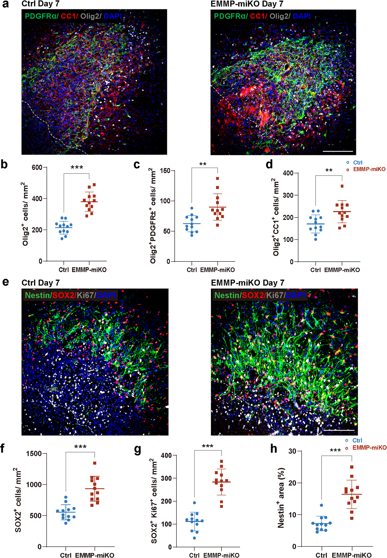 52]. The observed expansion of Olig2⁺, PDGFRα⁺, and CC1⁺ cells in EMMP-miKO mice indicates that microglial EMMPRIN may influence oligodendrocyte lineage dynamics, either directly through modulation of the extracellular environment, or indirectly by reducing the extent of injury in the first place. Moreover, the increase in SOX2⁺Ki67⁺ neural progenitors and Nestin⁺ regions suggests that microglial EMMPRIN also shapes the neurogenic niche. While the precise molecular link between microglial EMMPRIN and progenitor cell activation remains to be defined, our findings underscore the potential of EMMPRIN targeting not only to suppress injury but also to facilitate recovery.