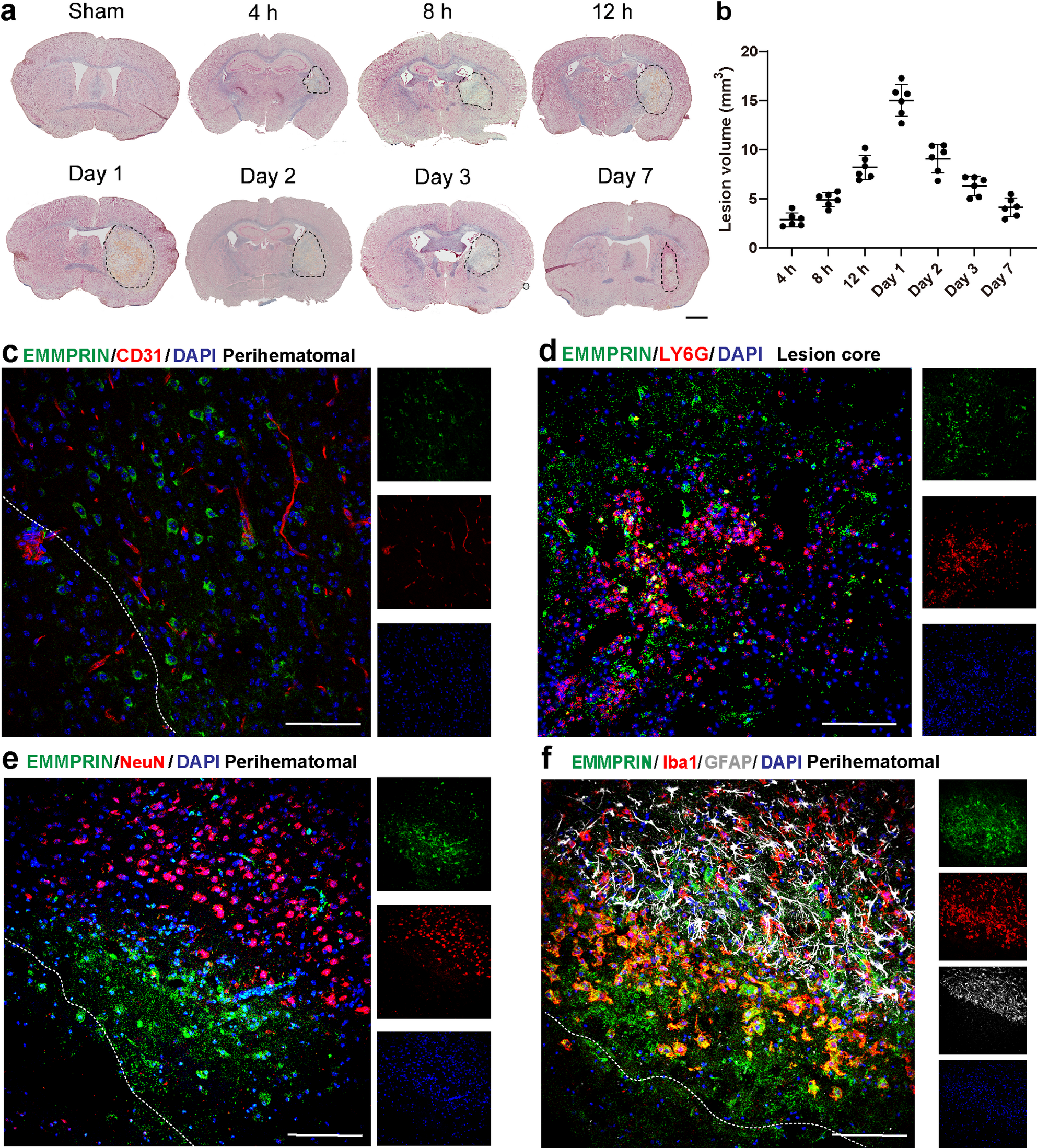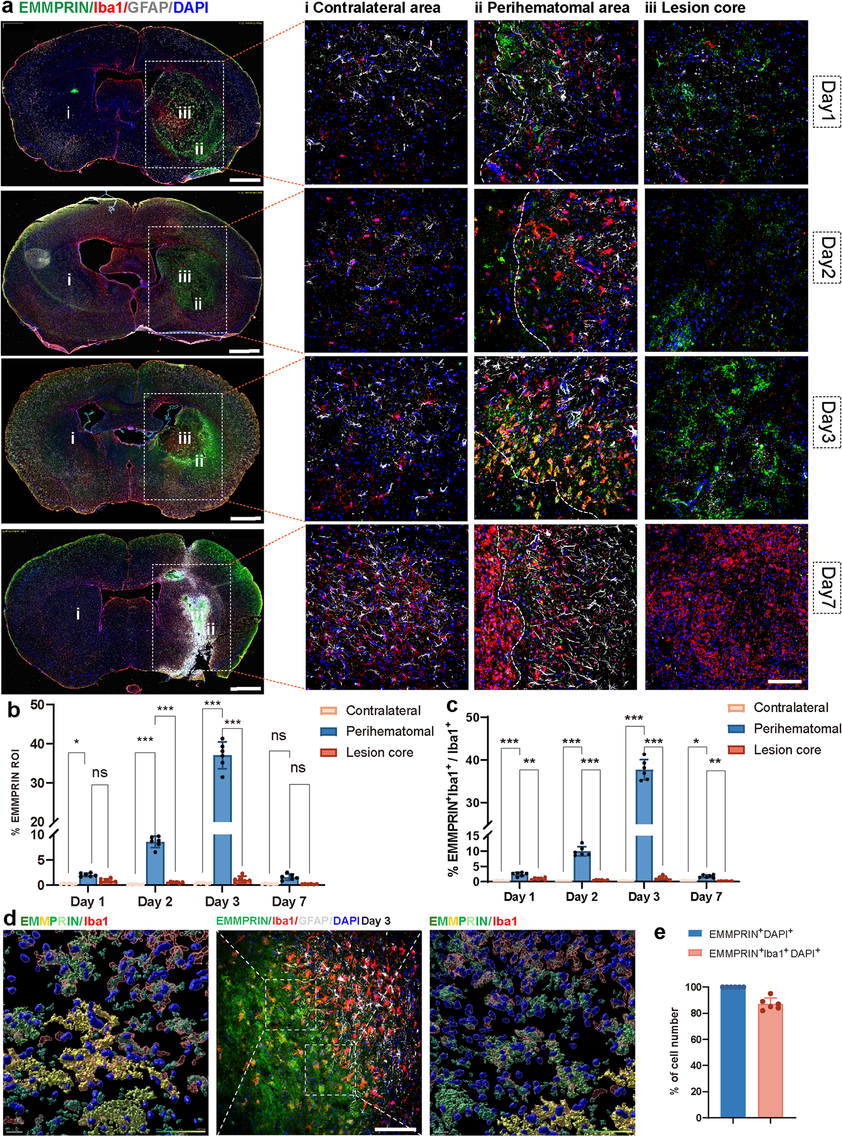 Our results reveal that EMMPRIN is rapidly and selectively upregulated in Iba1⁺ microglia/macrophages within the perihematomal region during the acute phase of ICH. This spatial restriction aligns with the region of maximal blood-brain barrier disruption, inflammation, and neuronal death, supporting a functional role for EMMPRIN in the local amplification of injury. EMMPRIN is known to drive MMP expression in both physiological and pathological contexts [