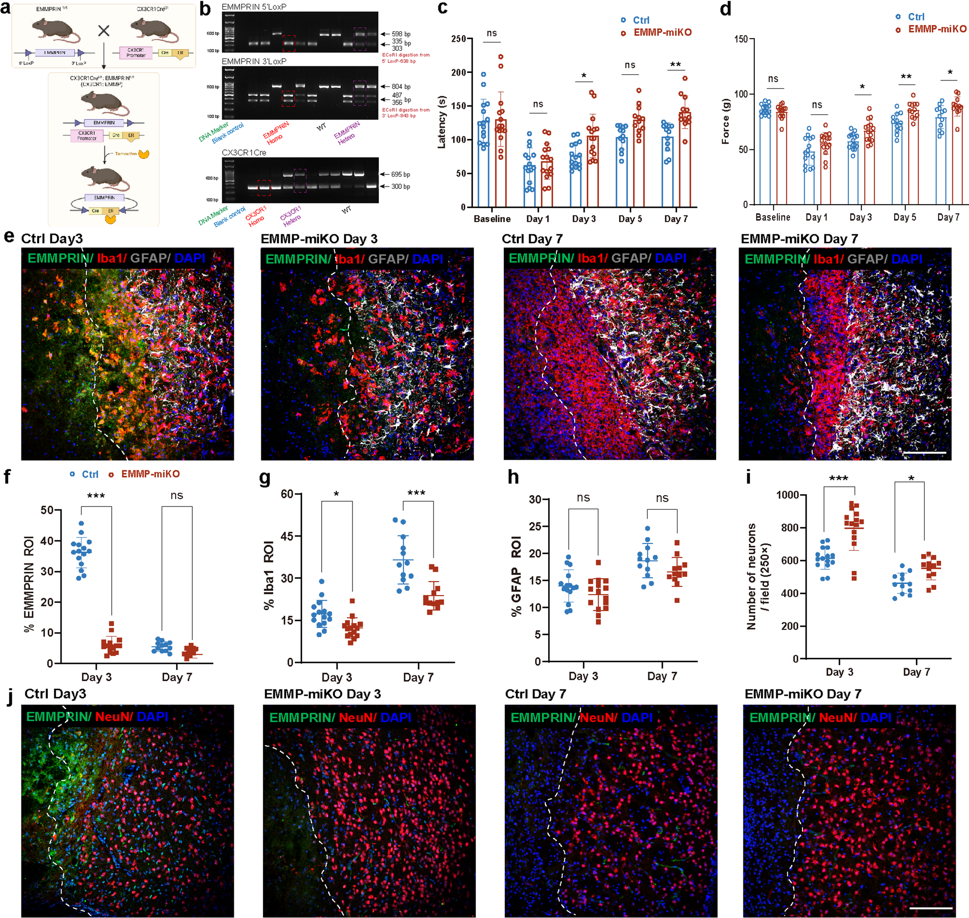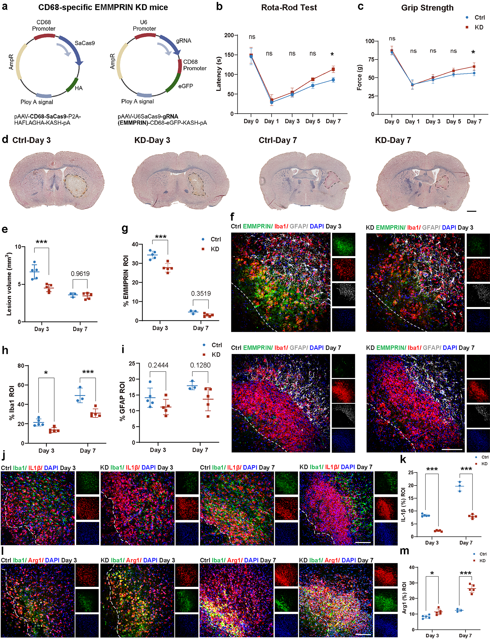 To further delineate the functional role of EMMPRIN in microglia/macrophages, we employed two complementary loss-of-function strategies: an AAV-based CRISPR/Cas9 knockdown targeting CD68⁺ myeloid cells and a tamoxifen-inducible, microglia/macrophage-specific conditional knockout model (EMMP-miKO) driven by CX3CR1