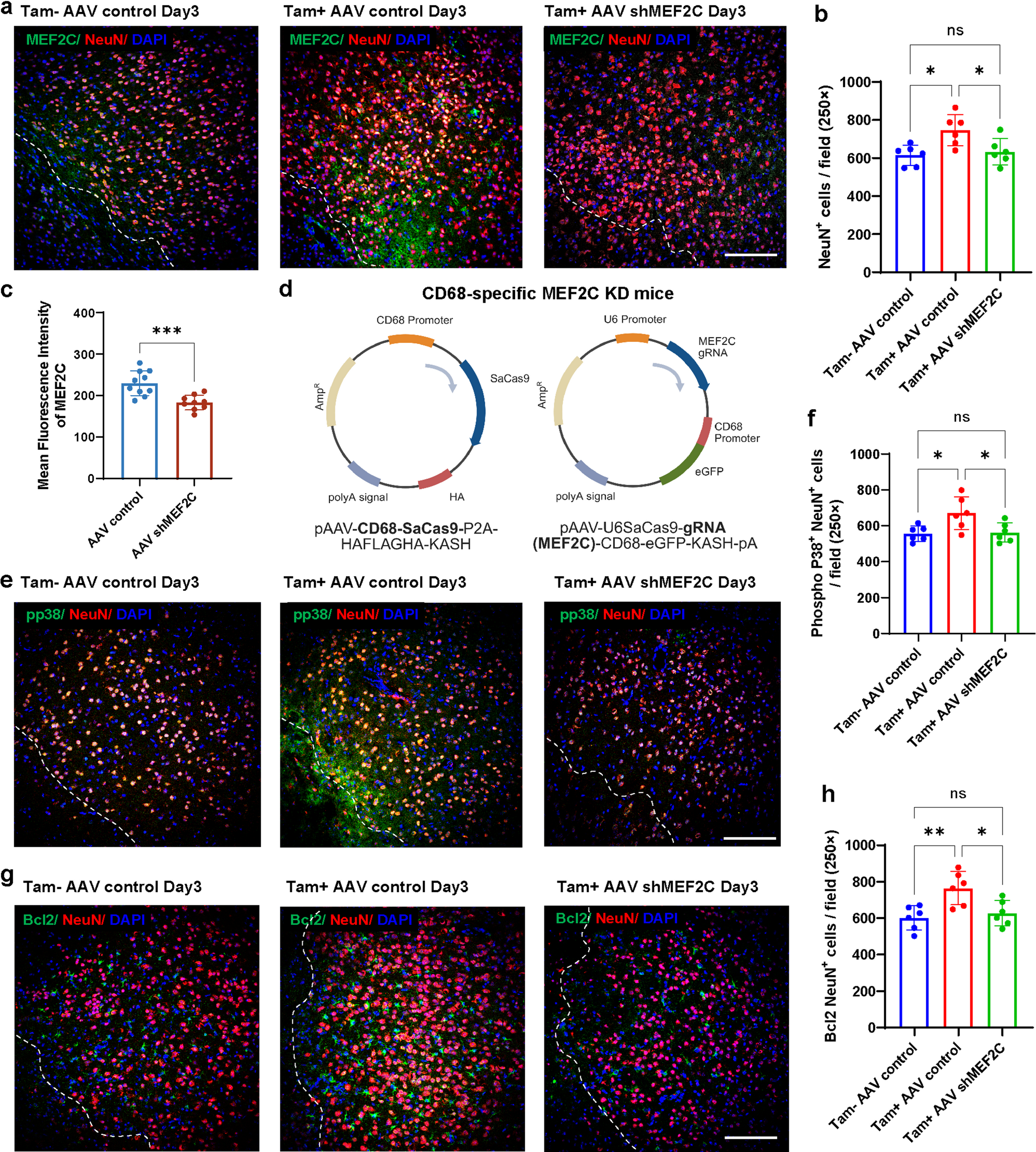 For MEF2C knockdown, EMMP-miKO mice and their littermate controls were administered AAV vectors encoding either a non-targeting control shRNA (AAV-control) or an shRNA against MEF2C (AAV-shMEF2C). Mice were treated with tamoxifen (Tam+) or vehicle (Tam−) as described above, resulting in four groups: Tam + AAV-control (EMMPRIN conditional knockout, MEF2C intact; n = 6), Tam + AAV-shMEF2C (EMMPRIN conditional knockout, MEF2C knockdown; n = 6), Tam − AAV-control (non-conditional control, MEF2C intact; n = 6) and Tam − AAV-shMEF2C (non-conditional control, MEF2C knockdown; n = 5). All mice in these groups subsequently underwent ICH induction.
