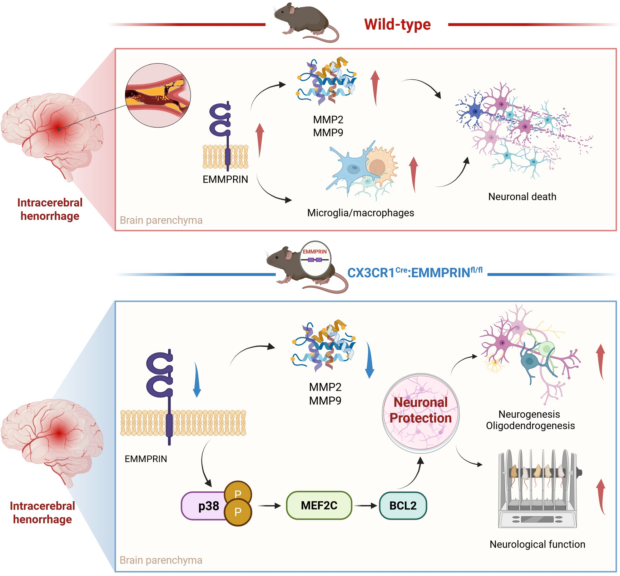 In the current study, we aimed to investigate the impact of targeted EMMPRIN deletion on brain injury and neuronal death following ICH. We utilized adeno-associated virus (AAV)-mediated EMMPRIN knockdown, and transgenic mice with inducible and conditional deletion of EMMPRIN from CX3CR1+ myeloid cells. With these mice after ICH injury, we describe a critical role for EMMPRIN elevation in modulating MMP expression, neuronal death and regenerative processes. Unbiased proteomics implicate the p38 MAPK/MEF2C signaling pathway downstream of EMMPRIN pathophysiology in myeloid cells. These findings provide new insights into the pathological function of EMMPRIN in hemorrhagic stroke and highlight its potential as a therapeutic target.