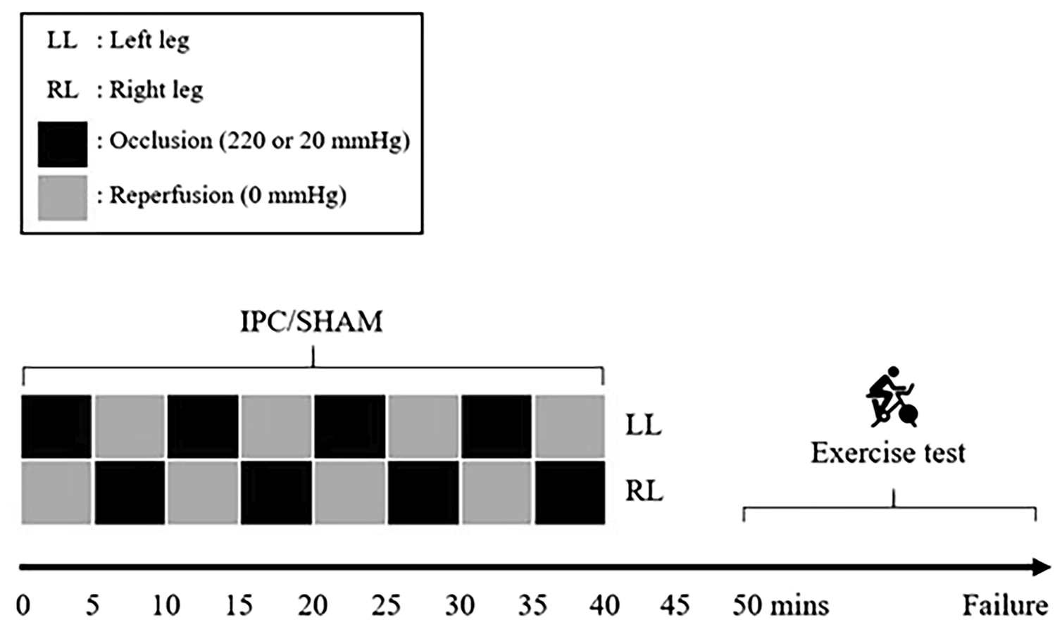 On the fourth and fifth visit an IPC or sham (SHAM) protocol (Fig. 1) was administered before the start of exercise. Both interventions were performed with the participant lying in a supine position with an inflatable tourniquet cuff (4.5" × 34" Easy-FIT Tourniquet Cuff, Delfi Medical Innovations, Vancouver BC, Canada) positioned on each of the upper thighs and pressurised using an automated system (Personalized Tourniquet System, Delfi Medical Innovations, Vancouver BC, Canada). For IPC, ischemia was achieved by inflating thigh cuffs well above the systolic arterial blood pressure to 220 mmHg. For SHAM, thigh cuffs were inflated to 20 mmHg. For IPC and SHAM, both limbs were subjected to four 5-min periods of cuff inflation in an alternating manner and lasting 40 min in total. Participants then waited 10 min following IPC/SHAM before starting measurements at rest (for 5 min) and exercise.