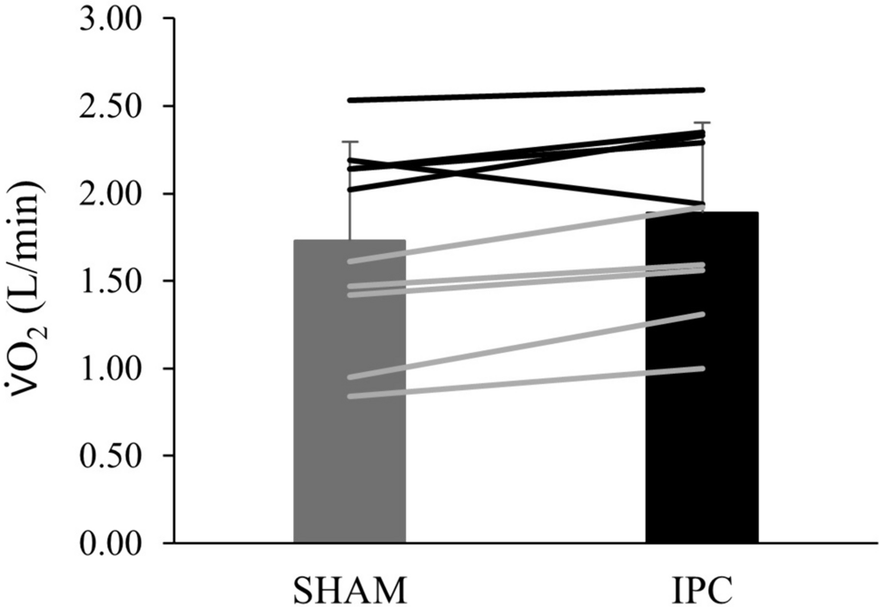 Rate of oxygen uptake (\(\dot{V}\)O2) (L/min) at the gas exchange threshold for sham and ischemic preconditioning (IPC) during the cycling ramp test. Individual (males = black lines, females = grey lines) and mean data (bars) ± SD, (N = 10)