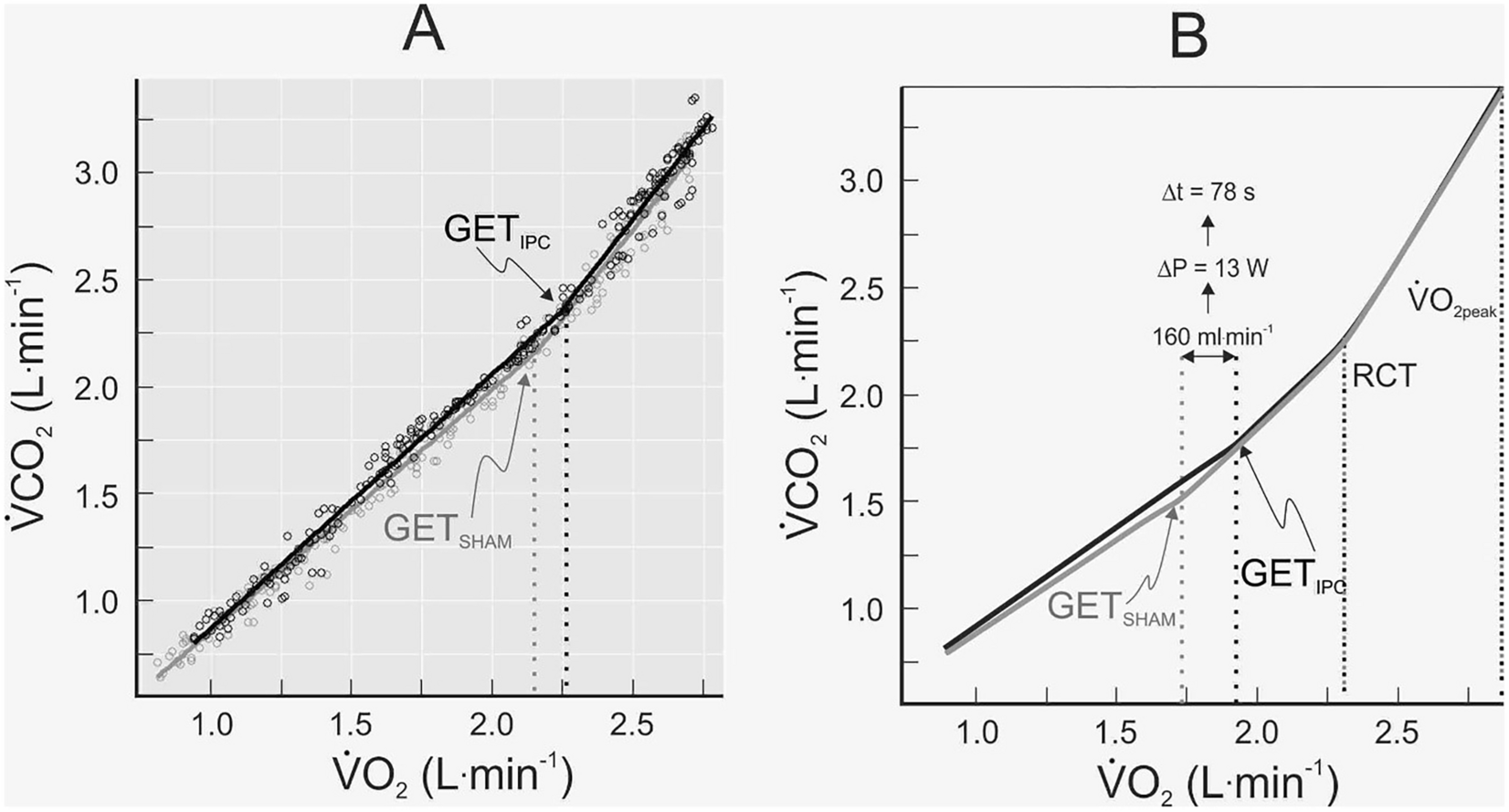 A: Breath-by-breath data for the rate of CO2 production (\(\dot{V}\)CO2) relative to rate of oxygen uptake (\(\dot{V}\)O2) during IPC and SHAM tests for a male subject. This subject was chosen because the overall effects of IPC on this subject’s responses were representative of group-averaged effects of IPC on the gas exchange threshold (GET). Lines of best fit to trimmed datasets are shown (see Methods). B: A cartooned illustration of the averaged effects of IPC on the \(\dot{V}\)CO2-\(\dot{V}\)O2 relationship, GET, respiratory compensation threshold (RCT) and peak \(\dot{V}\)O2 (\(\dot{V}\)O2peak) for the whole cohort (N = 10). The average effect of IPC on \(\dot{V}\)O2 at the GET (160 ml.min−1) was associated with an average increase in power of 13 W and a delay in the onset of the GET of 78 s
