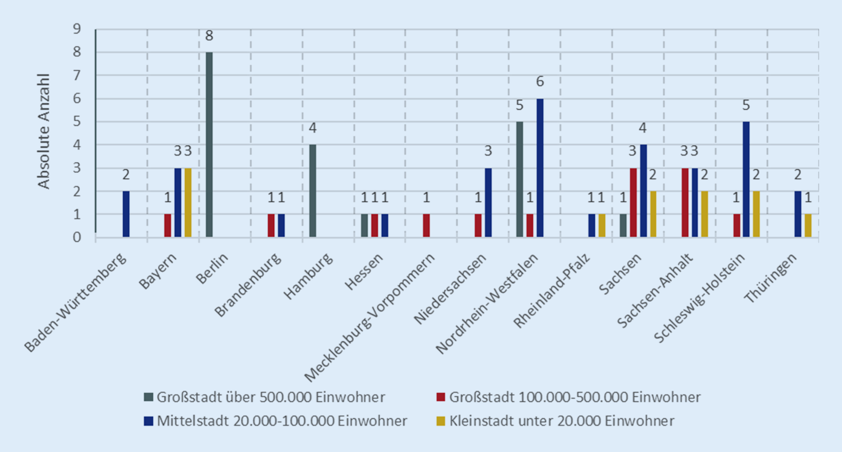 Im Jahr 2022 wurden 937 Patient*innen neu zum Telemonitoring unter Begleitung der QS-Maßnahme DOQUVIDE eingeschlossen. Durchschnittlich waren es 14 Patient*innen pro Praxis, wobei die Streuung mit 17,4 Patient*innen hoch ist. Knapp 60 % der Praxen schlossen weniger als 10 Patient*innen. 28,4 % dieser Praxen nahmen zwar an DOQUVIDE teil, schlossen aber aktiv keine Patient*innen ein. Lediglich sechs Praxen (8 %) schlossen mehr als 40 Patient*innen ein. Davon sind vier in den Großstädten Hamburg, Dortmund, Chemnitz und Essen ansässig, eine in der Mittelstadt Rendsburg (Schleswig-Holstein) und eine in der Kleinstadt Diez (Rheinland-Pfalz). Es ließen sich keine regionalen Unterschiede in der Anzahl der eingeschlossenen Patient*innen nach Städtegröße feststellen.