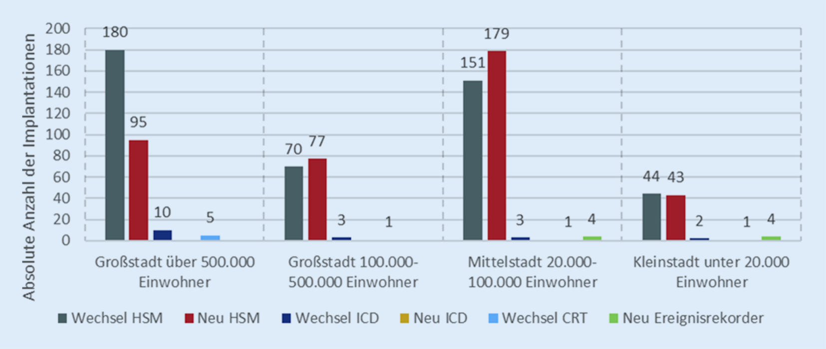 In Großstädten mit mehr als 500.000 Einwohnern fanden überwiegend Gerätewechsel statt, insbesondere von HSM (Abb. 2). Mit 62,1 % aller Eingriffe war der Anteil der HSM-Wechsel deutlich größer als in den anderen Regionen. Neuimplantationen von HSM fanden mit 32,8 % hingegen deutlich seltener statt. Es zeigte sich außerdem, dass Wechsel von ICD (55,6 %) und CRT (62,5 %) überwiegend in Großstädten mit mehr als 500.000 Einwohnern durchgeführt wurden.