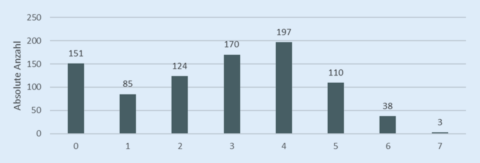 Insgesamt wurden 6687 Patient*innen aktiv unter Begleitung von DOQUVIDE mittels Monitoring überwacht. Im Durchschnitt waren es 90 Patient*innen pro Praxis (SD = 117,41). 22 % der Praxen überwachten weniger als 10 Patient*innen; 8 % sogar keine. Vierzehn Praxen (20 %) überwachten jährlich mehr als 200 Patient*innen, zwei davon sogar mehr als 400. Beide Praxen befinden sich in Großstädten mit über 500.000 Einwohner (Berlin, Hamburg).