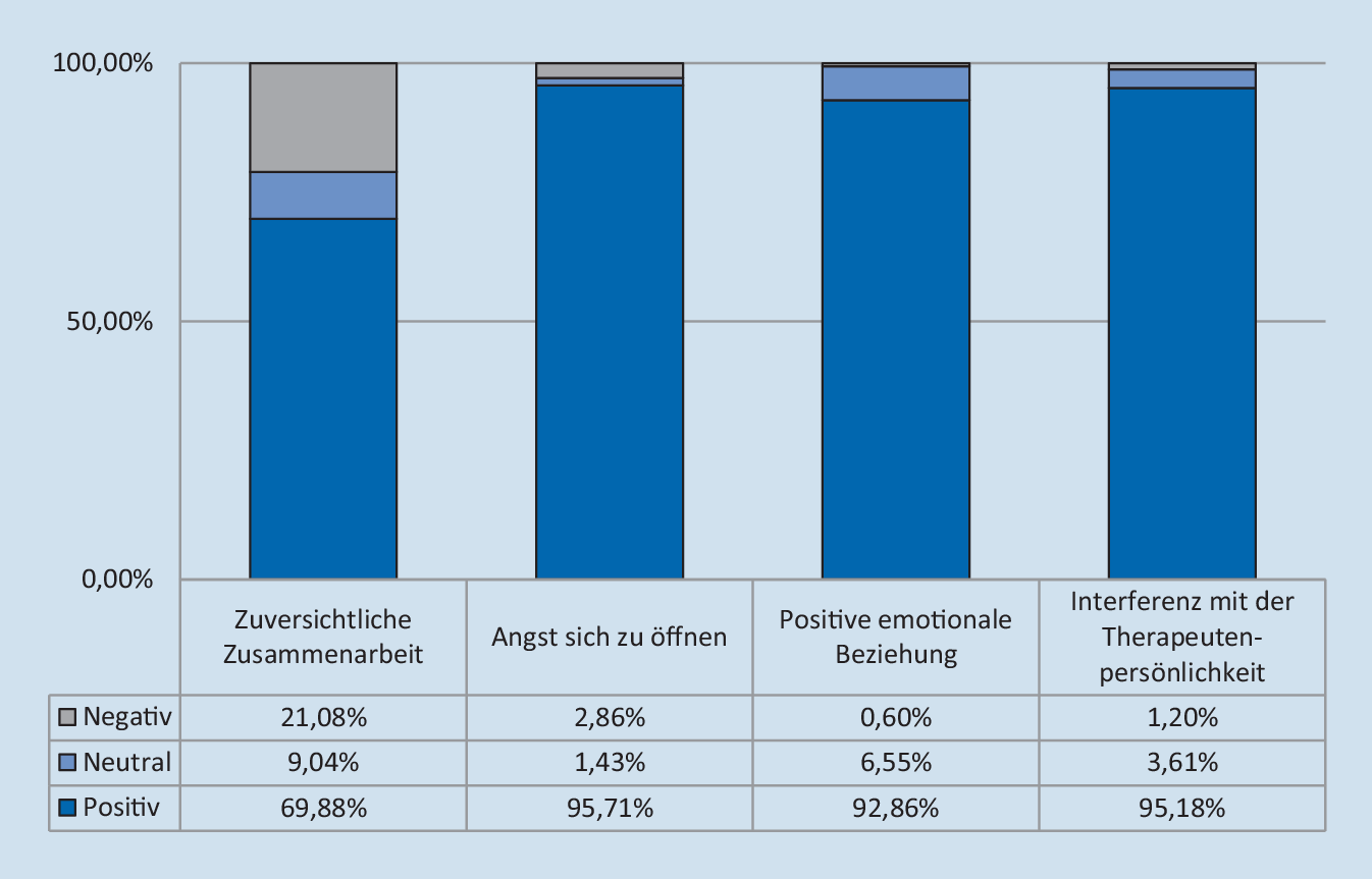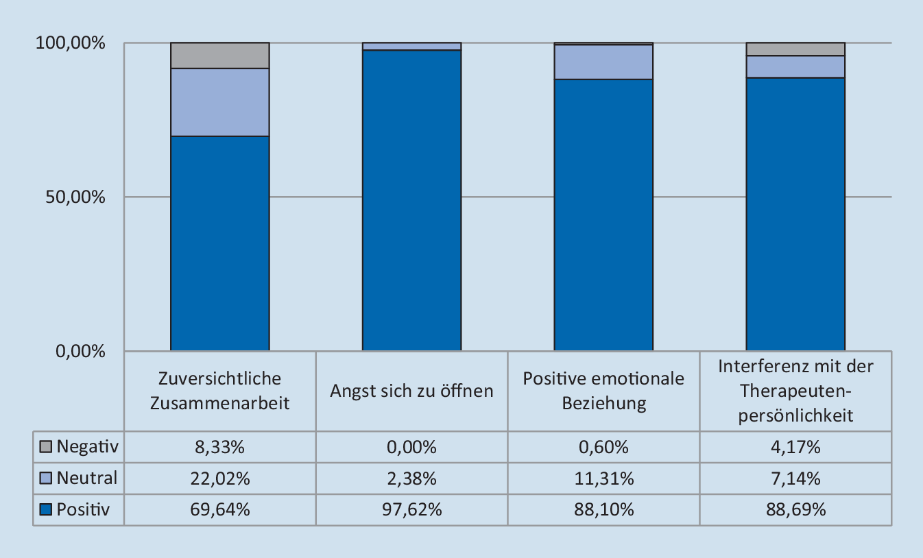 Die Zuversicht der Patienten hinsichtlich ihrer Zusammenarbeit mit dem Therapeuten (Skala 1) war hoch. In 82,1 % (±27,77) gaben diese an, dass sie ihre Therapieziele durch die Videotherapie erreichen können. Dies galt auch für die Therapeuten (69,01 % ±26,94) (p = 0,33).