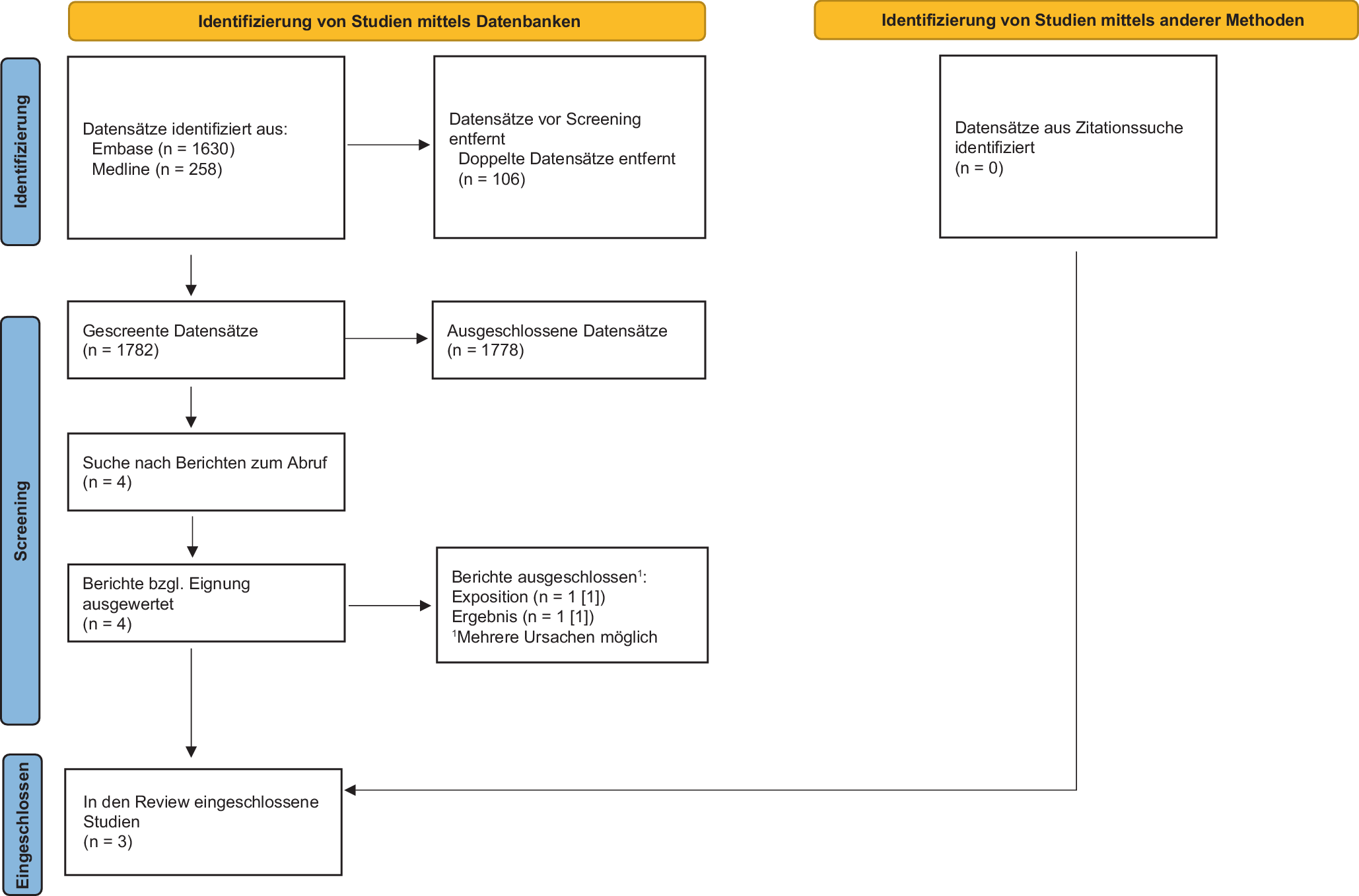 In Frage 4 bleibt die Suche in RCT- oder anderen Studienregistern unberücksichtigt, weil sie für systematische Reviews von Beobachtungsstudien nicht zutrifft.
