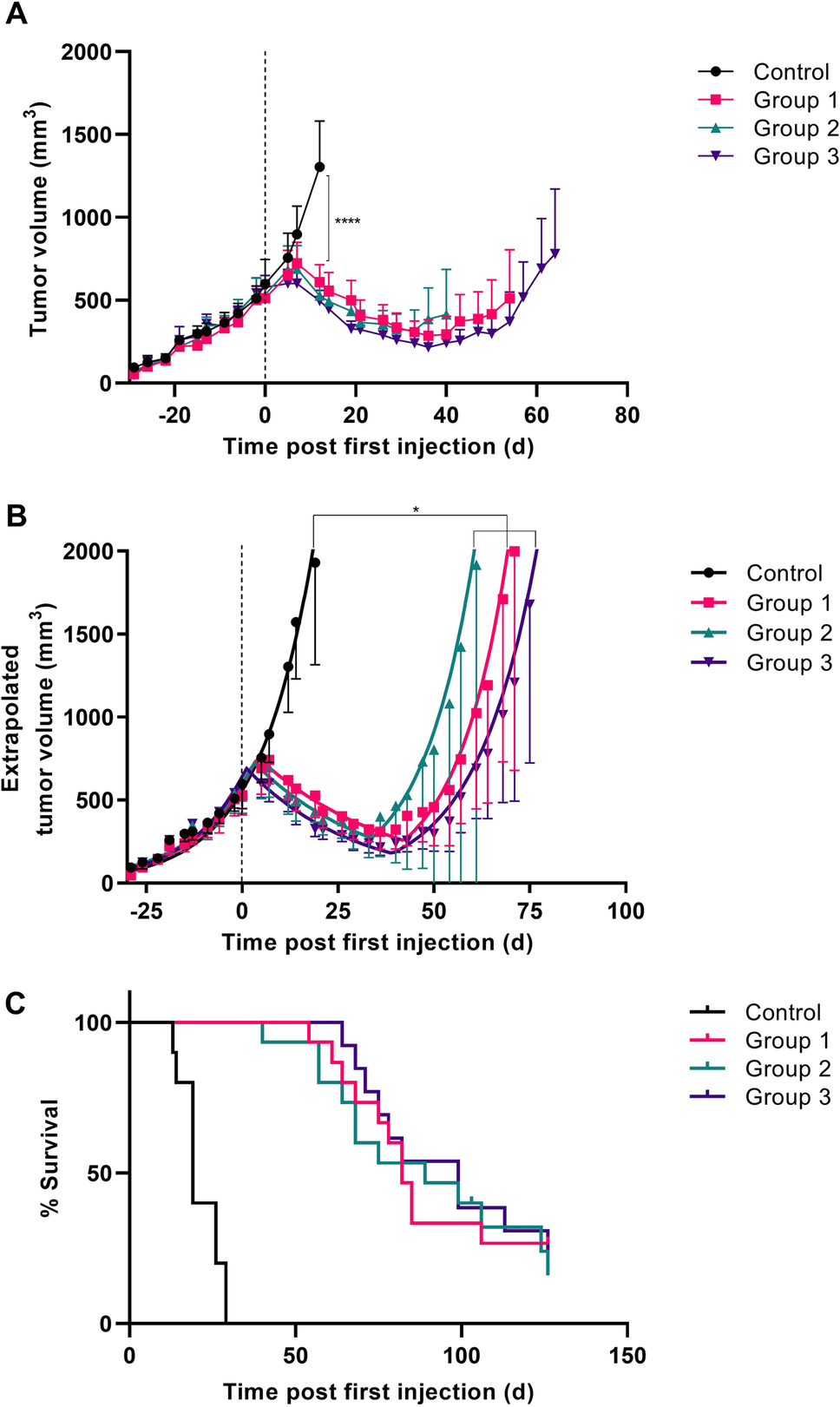 Regarding efficacy, this study demonstrated a significant delay in tumor growth and an increased median survival in all treatment groups