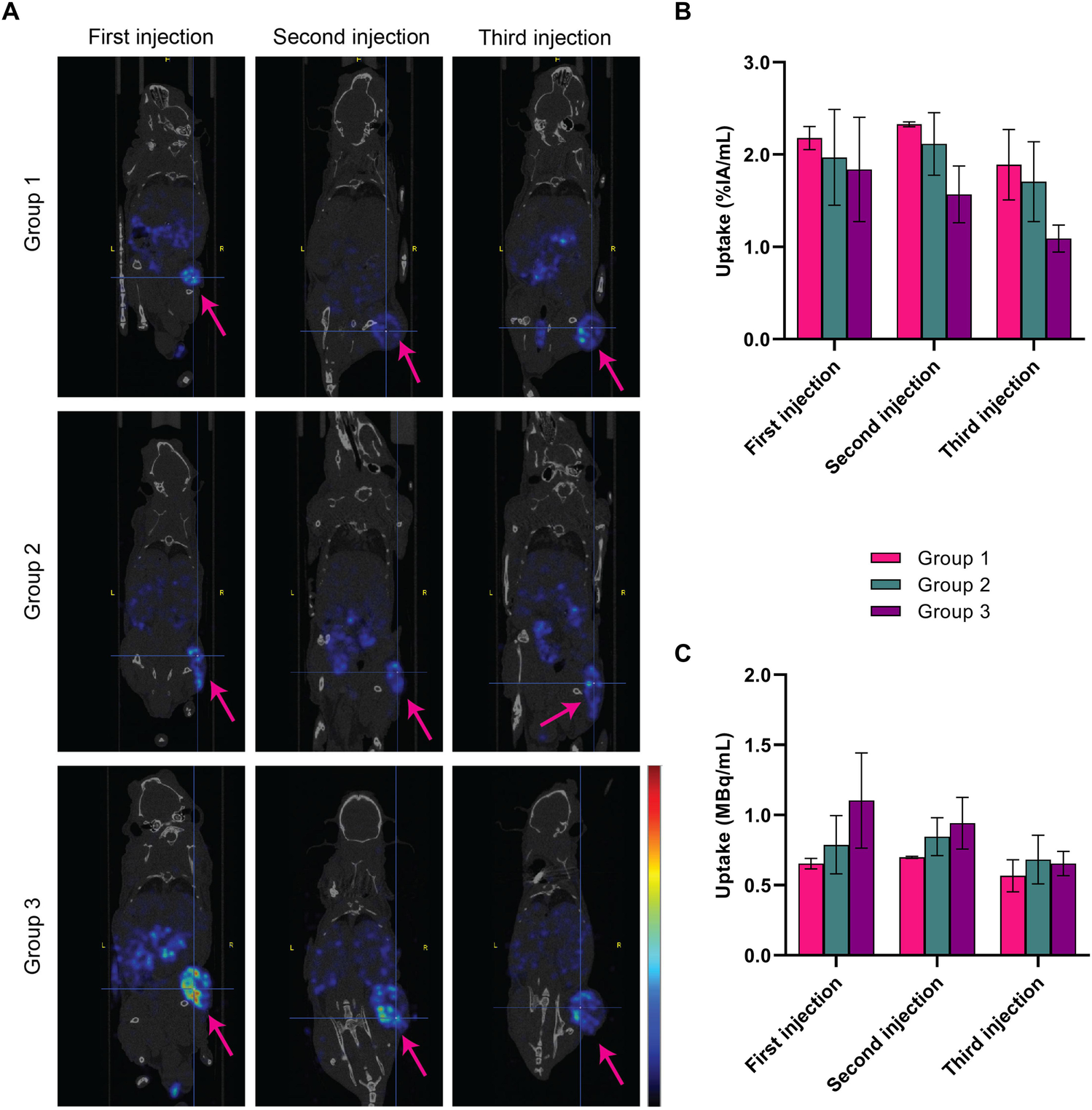 3, animals were injected with 3 consecutive injections of 30 MBq/300 pmol, 40 MBq/400 pmol, or 60 MBq/600 pmol [