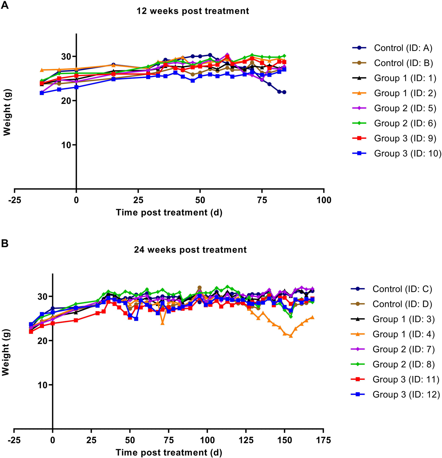 A preliminary toxicity assessment was conducted evaluating the effect of treatment on the pancreas and kidneys. For this, 6–8-week-old non-tumor-bearing balb c nu/nu male mice (n = 16, Janvier Labs) received the same treatment as the animals included in the efficacy study. At 2 different time points after the last therapeutic injection, i.e., 12 weeks and 24 weeks p.i. (n = 2 per time point for each group), animals were euthanized and pancreatic and renal tissues were collected for pathological analysis. During the toxicity study, animals were weighed twice a week and monitored for the aforementioned humane endpoints.