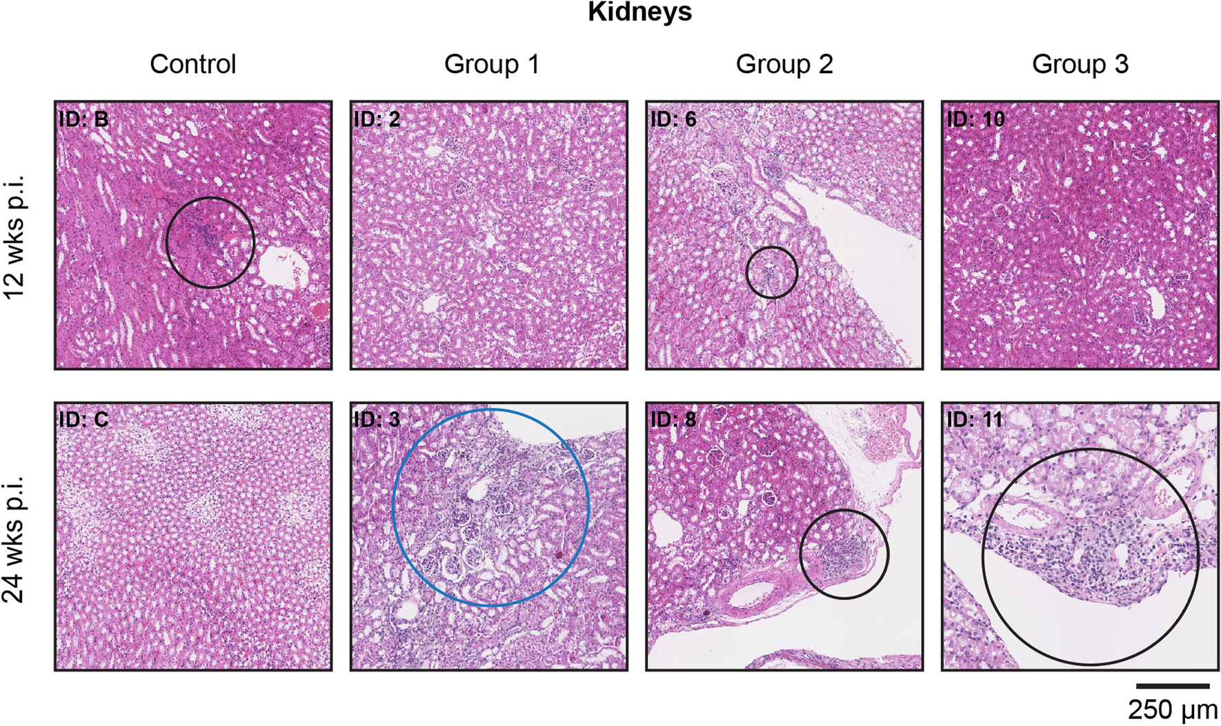 NeoB, like other radiopharmaceuticals, is primarily cleared from the body via the kidneys. Interestingly, at week 24, we found a chronic inflammatory response in the kidneys of both animals receiving the highest peptide amount. In addition, atrophy and fibrosis were reported for one animal of treatment group 1. Since we found no histopathological abnormalities after 12 weeks, these findings may suggest that renal toxicity is a late effect. This result has not previously been reported for other radiolabeled GRPR antagonists, most likely because the kidneys were histologically assessed at the endpoint of therapy studies, which is often around 12 weeks. Although our results should be interpreted with caution due to the small sample size, the initial observations suggest that there may be a link between the extent of toxicity and radioactivity dose injected. Our recently published work, previously mentioned, also reported late kidney damage at 19 and 43 weeks after treatment with high doses of 3 × 80 MBq/800 pmol or 3 × 120 MBq/1200 pmol [