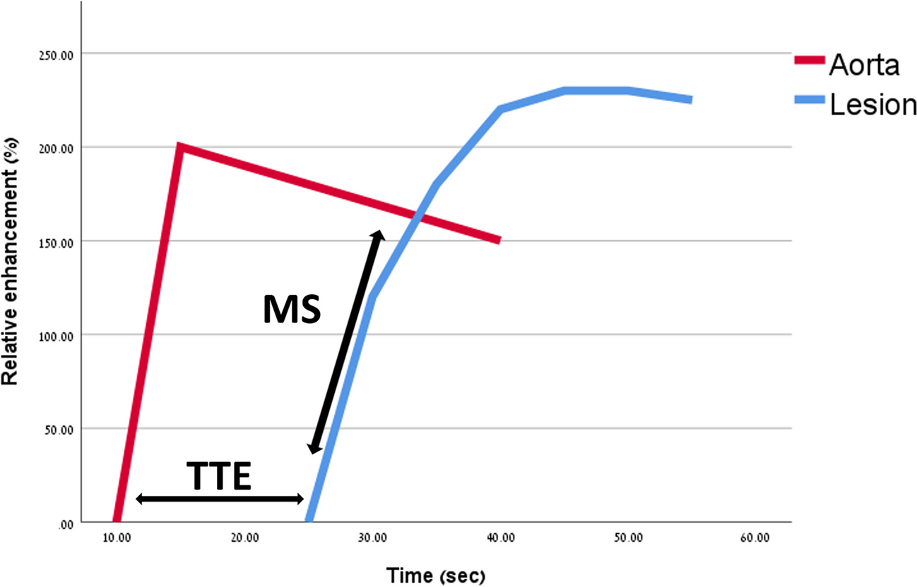Graphic illustration of MS and TTE. MS is defined as the steepest part of the lesion’s enhancing curve (%/s). TTE is calculated by the time point in which the lesion starts to enhance minus the time point where the aorta starts to enhance (s). MS, maximun slope. TTE, time to enhancement