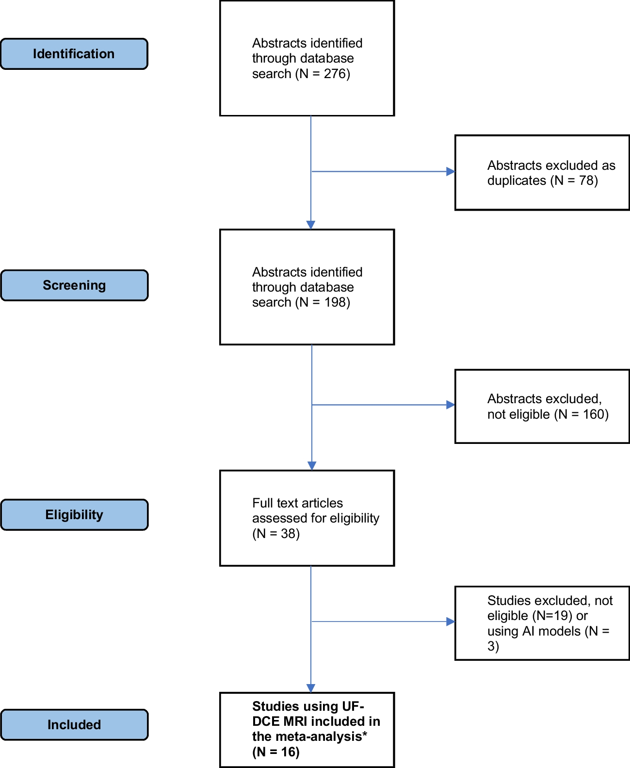 Prefered Reporting Items for Systematic Reviewes and Meta-Analysis (PRISMA) flowchart. UF-MRI, ultrafast magnetic resonance imaging. AI, artificial intelligence. *Typically, one or a combination of the following parameters is used: maximum slope, time to enhancement, bolus arrival time, arterial venous visualization, kinetic area under curve, or peak enhancement