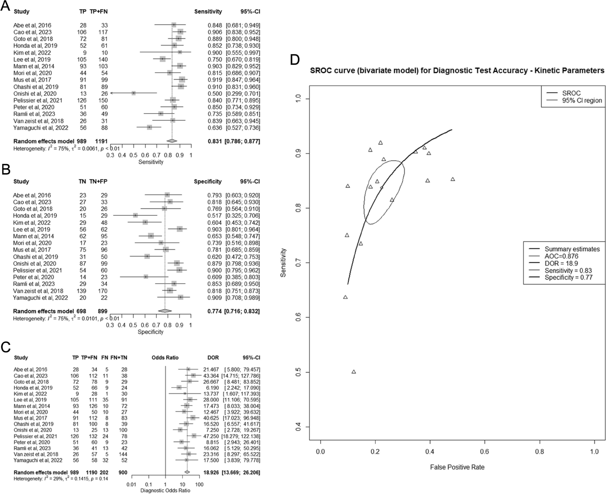 A final set of 16 studies analyzing 2090 lesions met the inclusion criteria and were incorporated into the meta-analysis. Using UF-DCE MRI kinetic parameters, the pooled sensitivity, specificity, DOR, and area under the curve (AUC) for differentiating benign from malignant breast lesions were 83% (95% CI 79–88%), 77% (95% CI 72–83%), 18.9 (95% CI 13.7–26.2), and 0.876 (95% CI 0.83–0.887), respectively. We found no significant difference in diagnostic accuracy between the two main UF-DCE MRI kinetic parameters, maximum slope (MS) and time to enhancement (TTE). DOR and SROC exhibited low heterogeneity across the included studies. No evidence of publication bias was identified (p = 0.585).