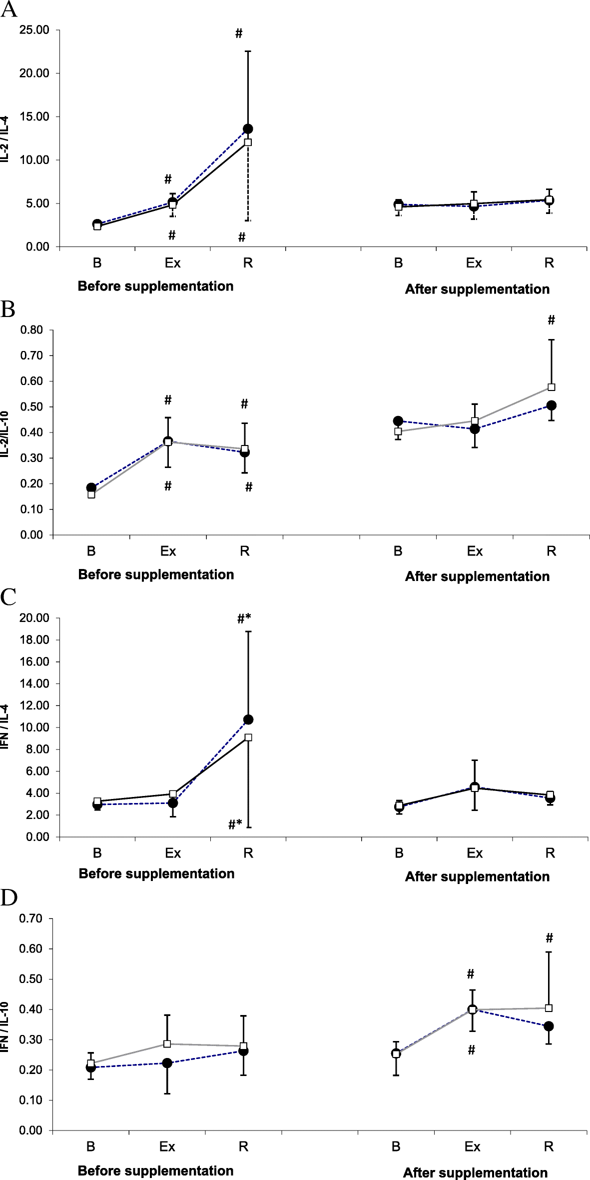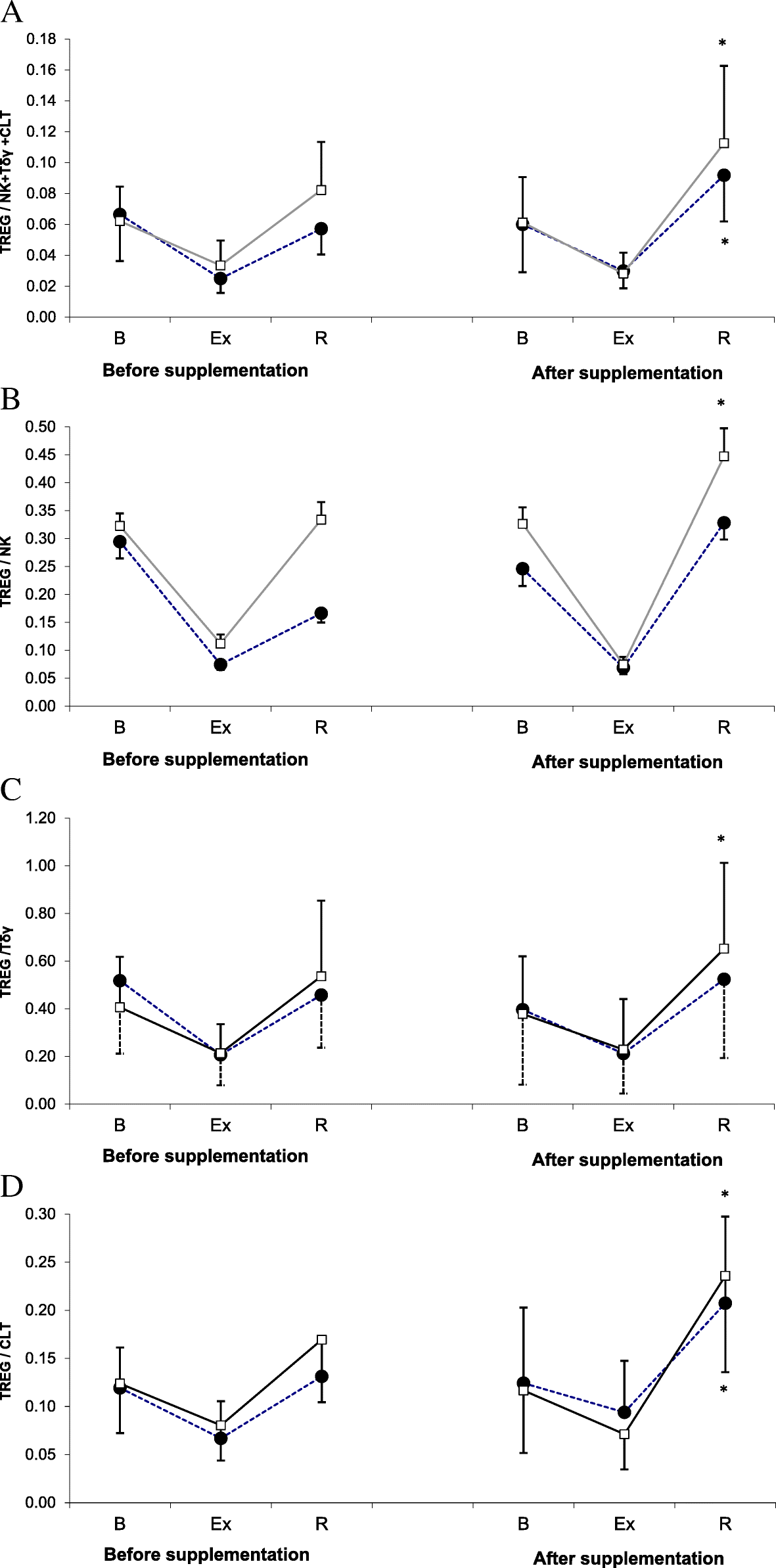 However, the results of supplementation were different when the number of Tregs and some cytotoxic cells, NK, Tγδ and CTL, were considered (Fig. 3). During the 2nd examination (after supplementation), the post-recovery Treg counts in both placebo group and supplemented group were significantly higher than at the baseline (Fig. 3a). Moreover, the post-recovery CTL count in athletes from the supplemented group was significantly lower than immediately after the exercise (Fig. 3d). Finally, during the 2nd examination, the post-recovery values of both Treg to NK and Treg to Tγδ ratios in the supplemented group were significantly higher than immediately after the exercise (Fig. 4b and c). The interpretation of these findings is not straightforward. Theoretically, the supplementation might contribute to a decrease in the number of cytotoxic CTLs. Also, the post-recovery increase in the values of Treg to NK and Treg to TCR ratios may suggest that the supplementation with LTE promoted unfavorable changes in the proportion of cytotoxic lymphocytes to Tregs. However, these results should not be interpreted without consideration of the cytokines synthesized by those cells, since otherwise, any conclusions about beneficial or unfavorable effect of LTE on immunity might be biased. A decrease in CTL count should be linked to a decrease in the level of IL-10 synthesized by Th2 cells, since according to literature, IL-10 promotes growth and differentiation of CTLs [29]. Equally important is the observation that the post-exercise increase in CTL count observed during the 2nd examination, although not statistically significant, was more evident in the supplemented group than in the controls. However, after a 24-h recovery, mean CTL counts in both groups were essentially the same.