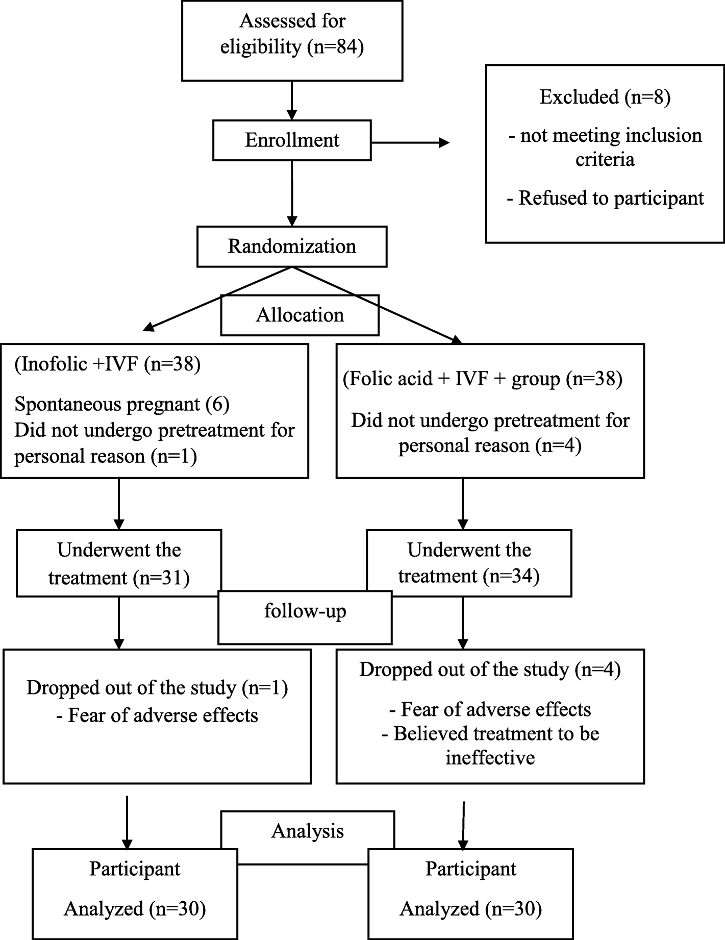All patients were divided into two pretreatment groups: Intervention group who receive Infolicpowder 4 g/daily-12 weeks and Control group who receive folic acid 400 mg/ daily-12 weeks. In the last cycle of pretreatment, two ampoulespergoveris (Merck-Serono, Switzerland) was prescribed daily from the second day of menstruation for 5 days. Then vaginalultrasonography using a 6–9 MHz convex-array transducer (Ultrasonix RP, Vancouver, BC, Canada) was done, and the GnRH antagonist (Cetrotide 0.25 mg sc, Merck-Serono, Switzerland) was prescribed daily. It was continued until the day of ovulatory hCG administration according to the ovarian response. The patientswere evaluated during 12–16 days of menstrual cyclesfor the response of the drug, the size of the follicles reachedin the ovary, and the thickness of the endometrium by vaginalultrasonography using a 6–9 MHz convex-array transducer (Ultrasonix RP, Vancouver, BC, Canada). When at least twofollicles were greater than 18 mm, 10,000 IU urinary hCG (Choriomon, IBSA, Lugano, Switzerland) Intramuscularly was administered for ovulation induction, and oocyte pickup was performed 34–36 h later.