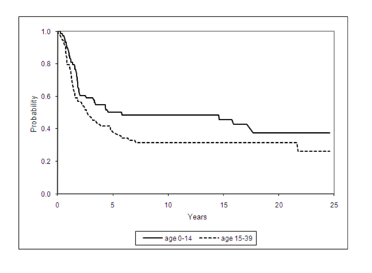 We have previously analysed the survival of children resident in northern England and the West Midlands during the same time period [15]. For children we found that whilst there was an improvement in survival from Ewing sarcoma, there was no improvement for osteosarcoma. The present study confirms that the lack of improvement in survival for osteosarcoma also applies at ages 15 - 39 years. However, it has indicated a worse outcome for Ewing sarcoma cases in age group 15 - 39 years. Another recent study from the USA analysed data from the Surveillance, Epidemiology and End Results Program and has found that there has been no statistically significant improvement in survival from osteosarcoma (at all ages) from 1984 to 2004 [27].