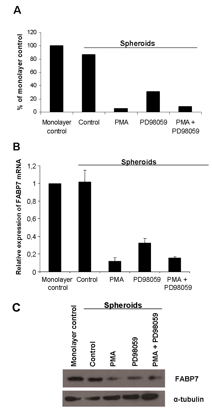 We previously showed that PMA-mediated PKC activation and activation of the MAPK/ERK1/2 pathway contributes to increased proliferation and reduced apoptosis of melanoma cells under anchorage-deprived conditions. In the present study we used gene expression profiling to identify additional genes involved in these processes, and found the FABP7 gene to be differentially expressed and down-regulated in WM35 spheroids following both PKC activation and MEK1 inhibition while no differences were observed between monolayer cells and untreated spheroids. PKC activation and MAPK/ERK1/2 down-regulation had opposite effect on anchorage-independent survival of the melanoma cells, but both negatively regulated FABP7. This observation argues against FABP7 involvement in promotion of anchorage-independent survival in these cells. Thus, it is likely that these pathways are regulating additional factors important for survival, independent of FABP7 down-regulation.