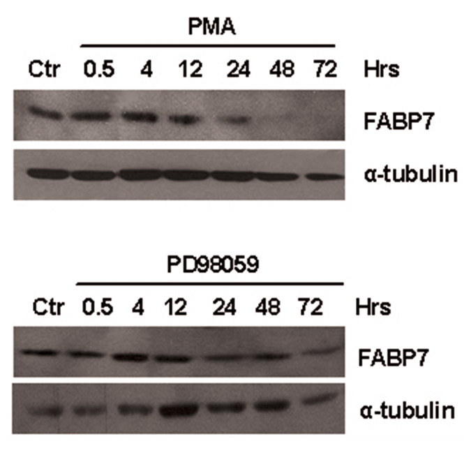 2]. Since PMA treatment down-regulates FABP7 even in the presence of activated ERK1/2 this down-regulation is likely to be PMA/PKC-mediated but MAPK/ERK1/2-independent. Together this suggests that FABP7 can be regulated by both signaling pathways independently in melanoma cells. Several reports have shown that activation of the MAPK/ERK1/2 pathway can induce increased activity of peroxisome proliferator-activated receptors α/γ (PPAR α/γ). Similarly, PKC can both positively and negatively regulate PPARα-dependent transcription [