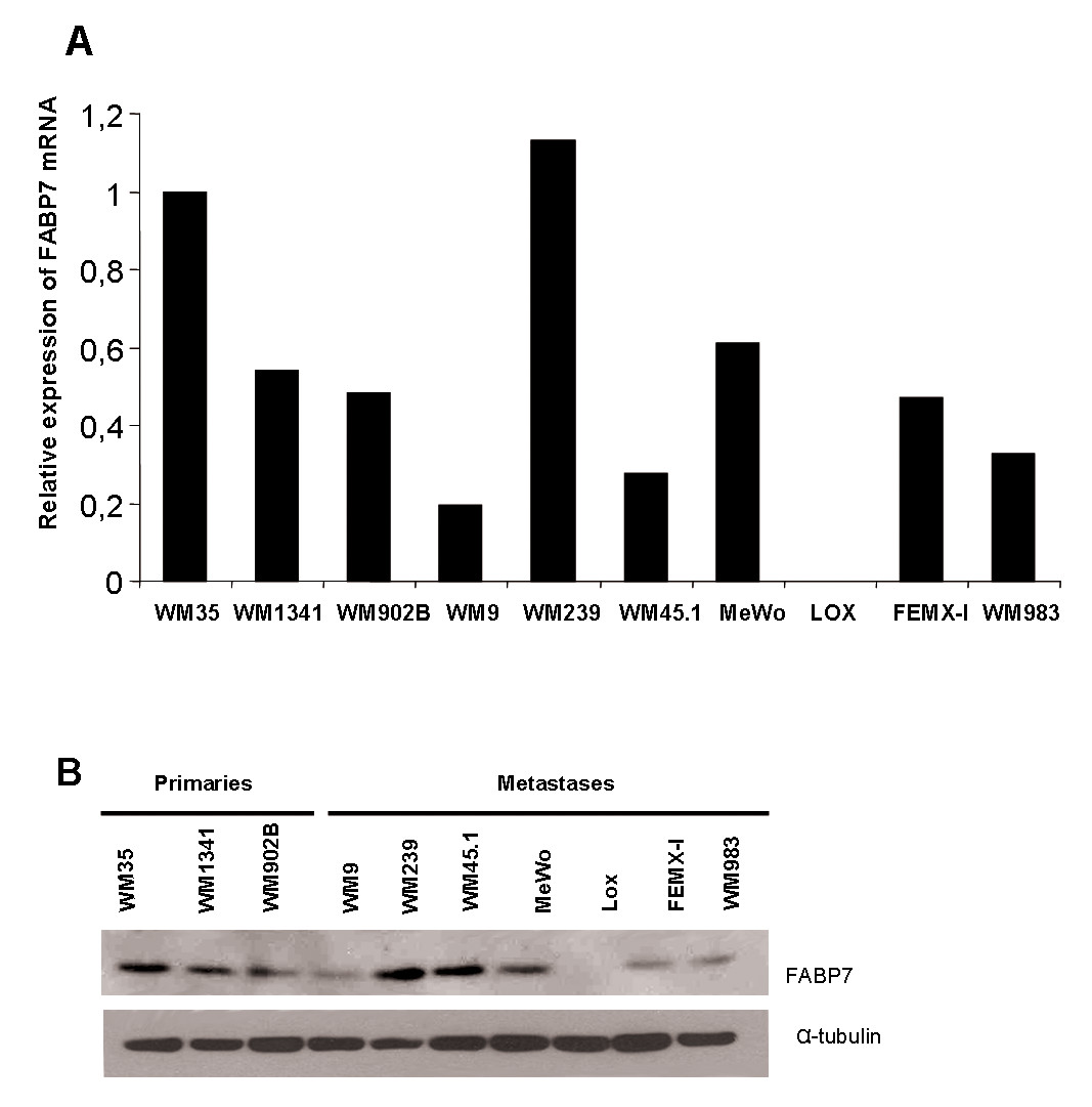 12] we found that FABP7 is expressed in both primary and metastatic melanoma cell lines, as well as in melanocytic lesions. However, there were no clear differences in FABP7 expression levels in primary derived compared to metastatic derived cell lines, suggesting that FABP7 is not associated with tumor aggressiveness. On the other side, cell lines are cultured in artificial environments that can not be directly compared to tumors