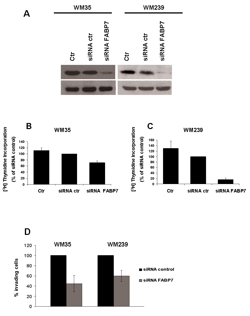 To further clarify the role of FABP7 in melanomas we used siRNA to down-regulate its expression in the primary WM35 and metastatic WM239 melanoma cell lines. This down-regulation notably inhibited proliferation in both cell lines, but did not affect the degree of apoptosis, arguing for involvement of FABP7 in melanoma proliferation. In support of our results, Goto