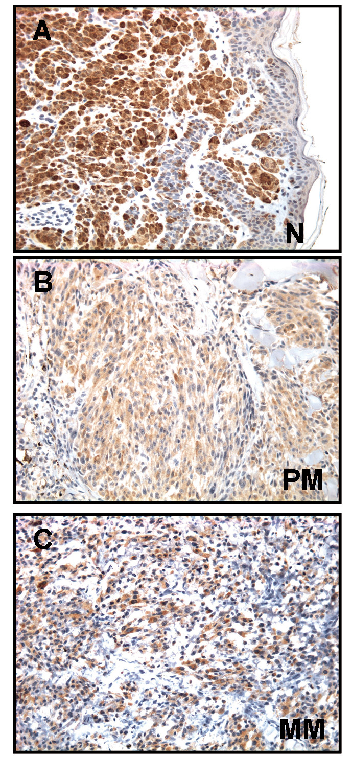 Malignant melanoma is the most lethal skin cancer and accounts for about 75% of all deaths from skin tumors. In its early stage, melanomas can be treated surgically, but once the tumor has progressed, it is difficult to treat and it does not respond to current therapies. The molecular mechanisms underlying melanoma development and progression are still not completely understood, and novel diagnostic and prognostic markers, as well as therapeutic targets are needed [