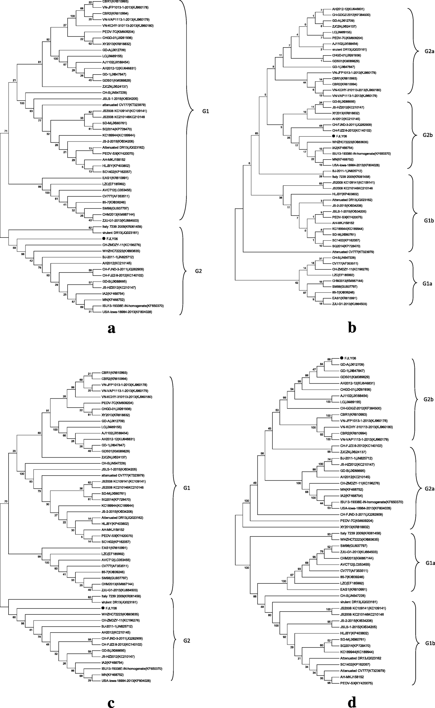 Nucleotide sequence similarity were assessed by SimPlotv.3.5.1, and showed that the FJLY06 is very similar to other sequences in G2 group (Fig. 1d) and can be inferred from the same ancestor. However, there were differences between Fujian’s strains and reference strains in G1 group (Fig. 1d), located within N-terminus of the S protein (Fig. 2), suggested this region in the S gene exhibited an increased divergence compared to the remaining part of the sequence, and the recently isolated prevailing PEDV strain in Fujian is a novel strains with a variant S gene and maybe originated between classical and variant strains [5, 6].