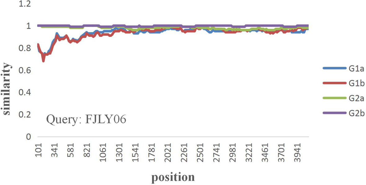 Detection of potential recombination events in FJLY06. SimPlot analysis for possible recombination events of S genes of Fujian’s strains compared to the G1 and G2 groups
