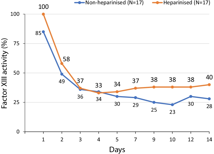 Trial 17 | Levy et al. [34] | 2009 | Surgery | Randomised controlled trial | 35 patients were randomised to FXIII and 8 to placebo after cardiopulmonary bypass | 11.9, 25, 35 or 50 IU/kg FXIII or placebo in a 4:1 ratio | In the FXIII group, dosing with 25–50 IU/kg restored FXIII levels to those seen pre-operatively with a tendency towards overshoot in the 50 IU/kg group and for post-operative FXIII replenishment 35 IU/kg may be the most appropriate dose |
