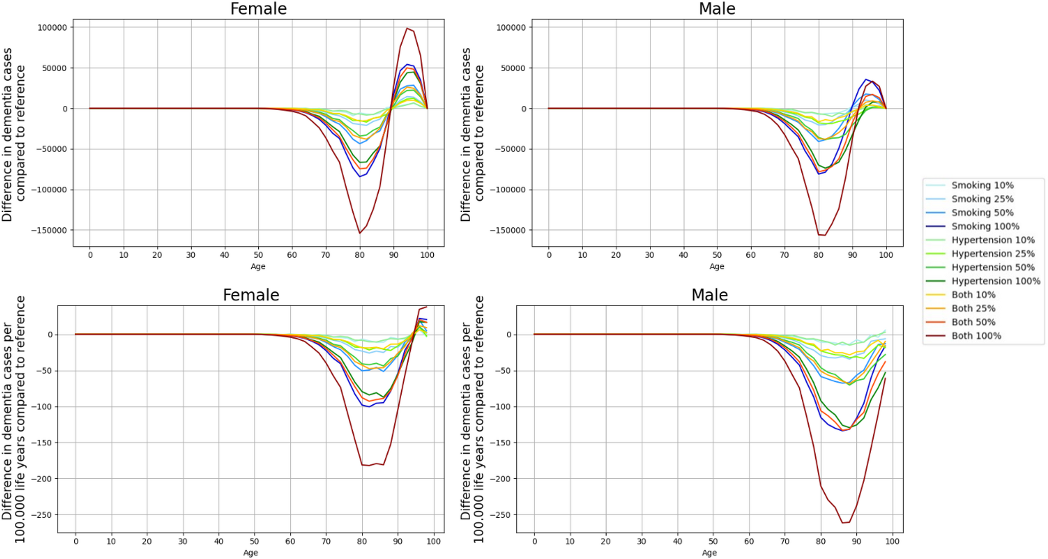 Complete elimination of smoking or hypertension led to fewer dementia cases. For women, the reductions were 1.4% for smoking, 1.1% for hypertension, and 2.5% for both. For men, the reductions were 2.5% for smoking, 3.3% for hypertension, and 6.2% for both (Table 2). The effect increases almost linearly with the magnitude of the reduction (Fig. 1). The complete elimination of both risk factors reduced the lifelong probability of developing dementia for an individual free of dementia at age 65 from 54.5 to 53.1% for women and from 35.5 to 33.3% for men (Supplemental Table C3). All reduction scenarios reduced the number of dementia cases in younger ages and then increased for the oldest old (Fig. 2, top panels).The shift from fewer to more dementia cases takes place at age 88 to 90 for women and at age 91 to 96 for men depending on the reduction scenario (Fig. 2, top panels). Whereas we found that absolute cases increased at older ages compared to the reference scenario, the relative rate adjusting for life years lived was reduced for each age and sex group (Fig. 2, bottom panels), except for women over 95 years (Fig. 2, bottom left panel). The complete elimination of both risk factors simultaneously has the largest impact (up to 188 fewer cases for women and 267 cases for men per 100,000 life years; Fig. 2, bottom panels). With a considerable gap, complete elimination of smoking, 50% reduction of both and complete elimination of hypertension have the second to fourth largest effect. To illustrate the size of the population to which these findings apply at various ages, Supplemental tables C1 and C2 provide the corresponding population sizes of all reduction scenarios.