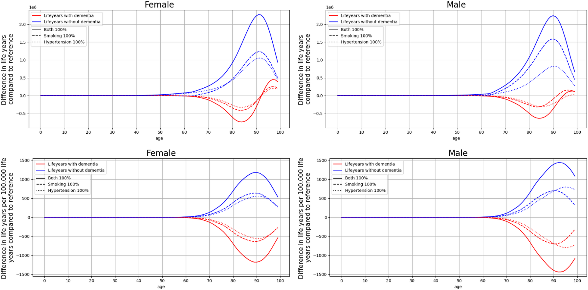 The reduction of late-life smoking and mid-life hypertension results on a population level in a modestly lower incidence and prevalence of dementia, fewer dementia cases, fewer life years with dementia and more dementia-free life years. These interventions reduce the number of dementia cases and life years with dementia particularly before the age of 90, after which there is a small increase due to increasing life expectancy outweighing dementia incidence reductions. On balance, when considering the life years lived across age groups, reduction scenarios result in fewer dementia cases and life years with dementia.