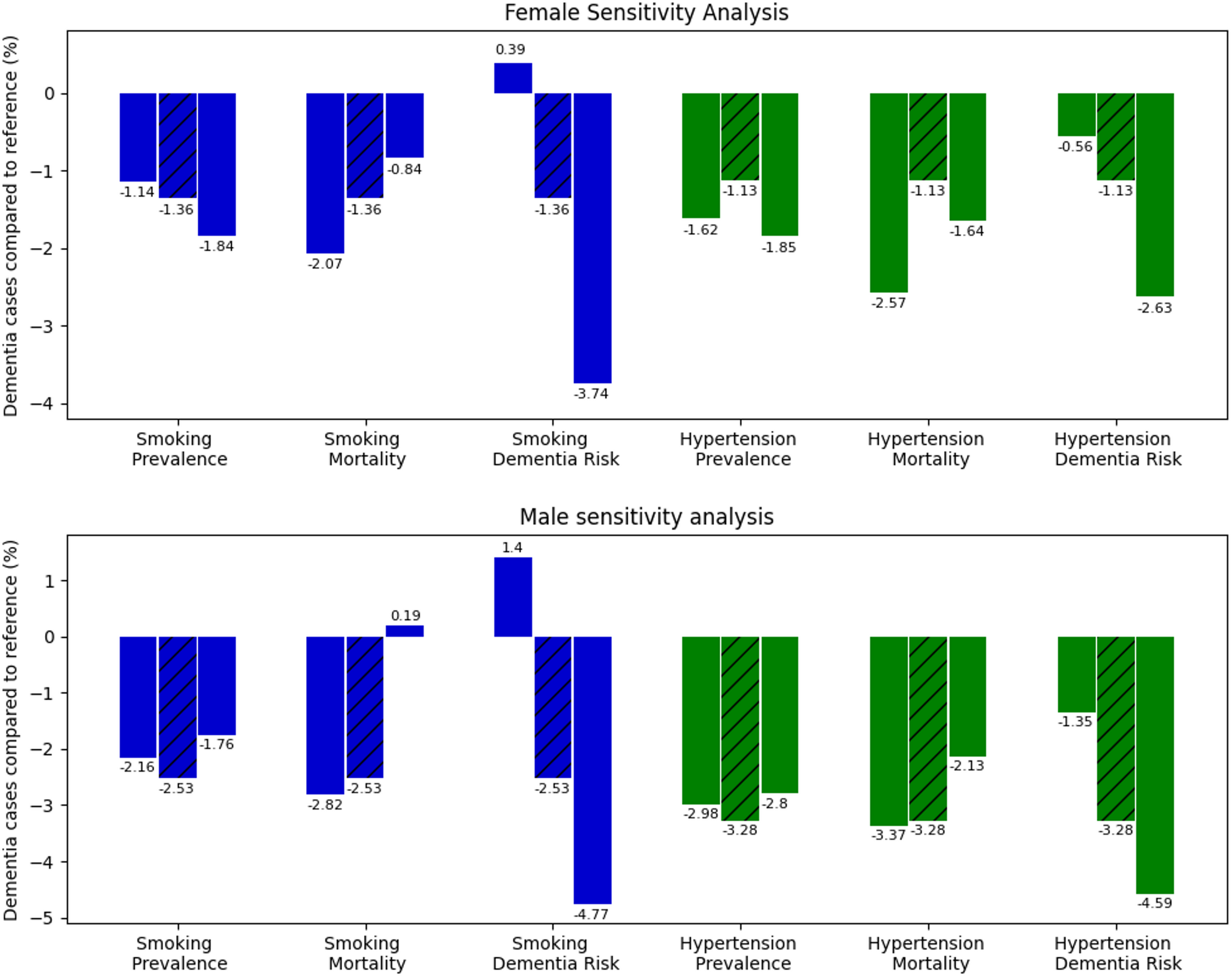 Sensitivity analysis of the risk factor prevalence, mortality and dementia risk on the potentially avoidable dementia cases in percent for the complete smoking (blue) and hypertension (green) compared to the reference scenario