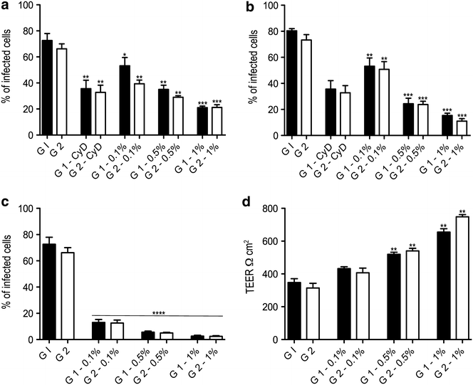 C. parvum in the absence of the supplement. The pre-treatment of host cells with increasing concentrations of Auranta 3001 (0.1–1%), lead to a significant inhibition of invasiveness for both parasites (Figs.