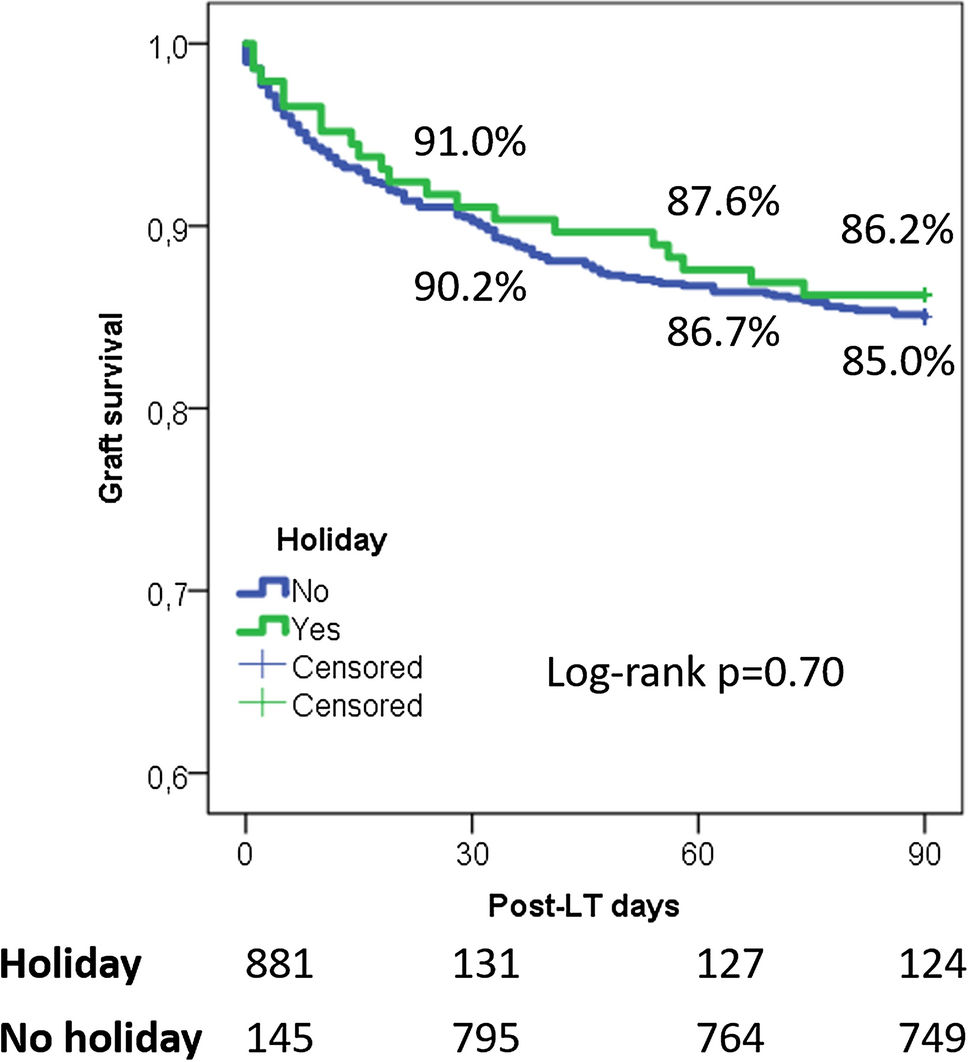 According to the present multicentre study results, the number of LTs is reduced on holidays and during the Monday. However, no substantial differences in terms of early and late survival rates were observed. Our data are in concordance with several previous studies.