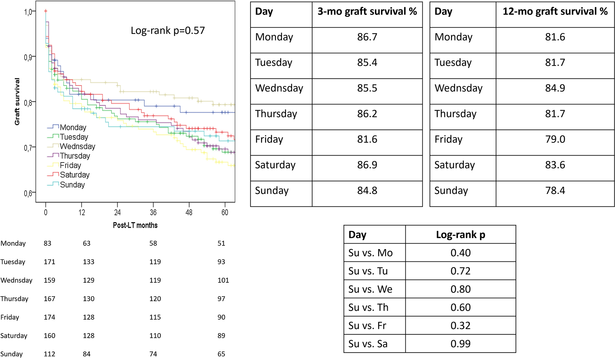 Several explanations have been advocated for explaining such results, like (a) an impaired technical performance or perioperative decision making due to fatigue, (b) several previous surgeries performed by the transplant team on call for the weekend, (c) and the surgical services support staff heterogeneously composed by members of cross-disciplinary teams also involved in other surgical emergencies.