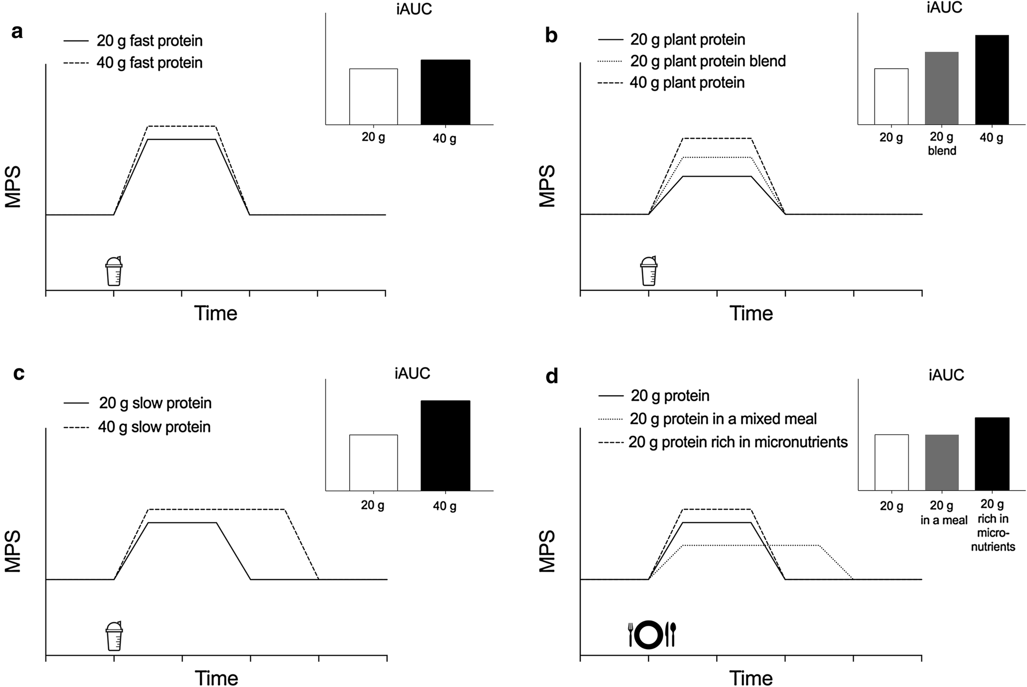 Conceptual representation of the muscle protein synthesis (MPS) response to various feeding protocols. a The ingestion of ~ 20 g quickly digestible protein results in a near-maximal MPS response. b The ingestion of 20 g plant-based protein typically results in a submaximal MPS response, but the consumption of a greater amount and/or mixing different sources may possibly augment the MPS response. c The ingestion of 20 g slowly digestible protein results in a submaximal MPS response, but the ingestion of greater amounts may result in a more prolonged anabolic response. d Mixed meal ingestion may result in a more moderate but prolonged MPS response compared with ingestion of an isolated whole-food protein source. The micronutrient content of a whole-food protein source may further augment the MPS response. iAUC incremental area under the curve