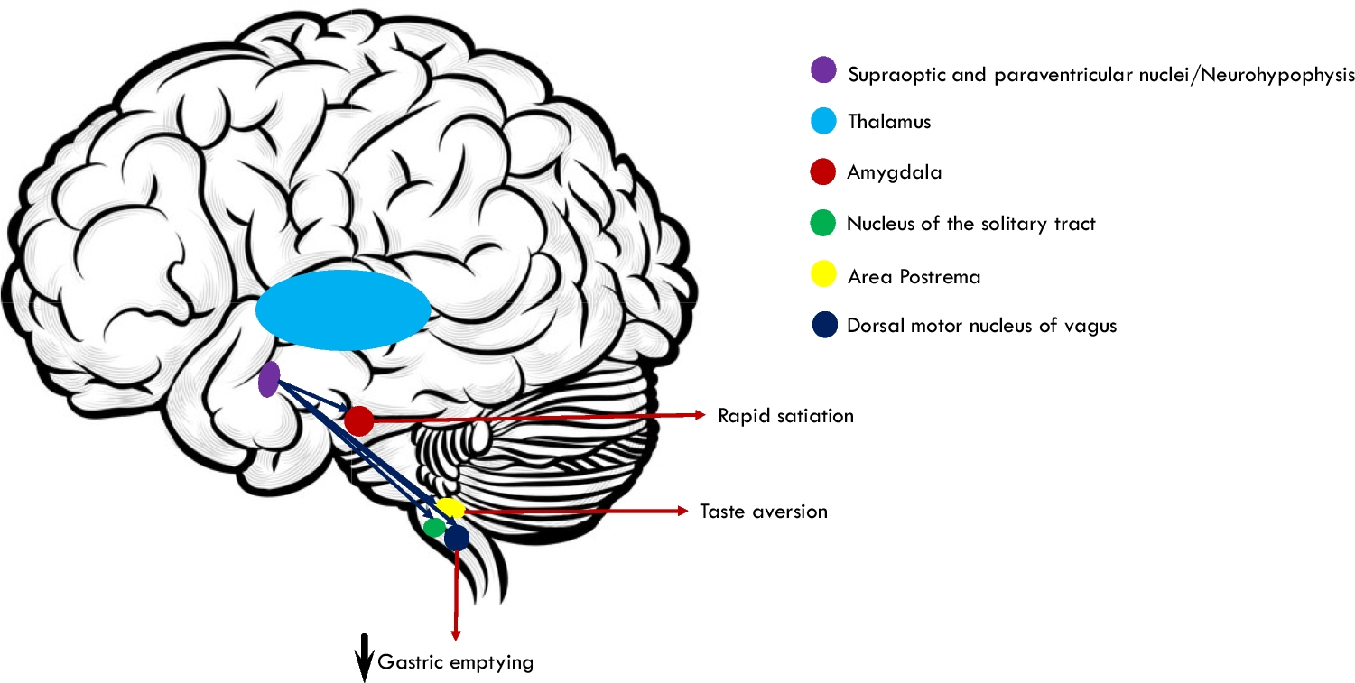 Hypothalamic OT-secreting neurons project to different cerebral areas controlling eating behaviors, such as the amygdala, area postrema, nucleus of the solitary tract, and dorsal motor nucleus of the vagus nerve. Intracerebral/ventricular OT administration decreases food intake and body weight in wild and genetically obese rats. OT may alter food intake and the quality of meals, especially carbohydrates and sweets, in humans.